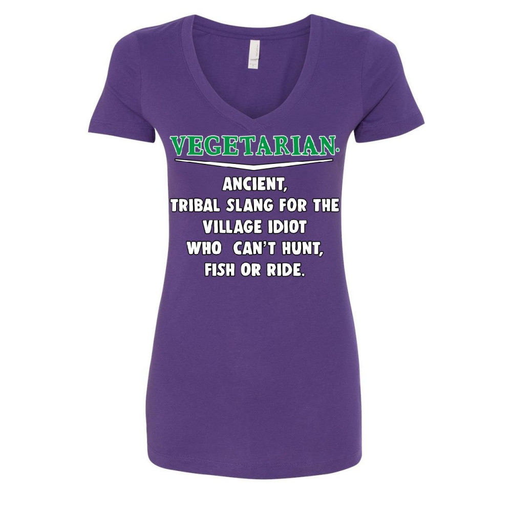 VEGETARIAN - VILLAGE IDIOT vegetarian definition women's v-neck t-shirt offensive village idiot vegan meat purple