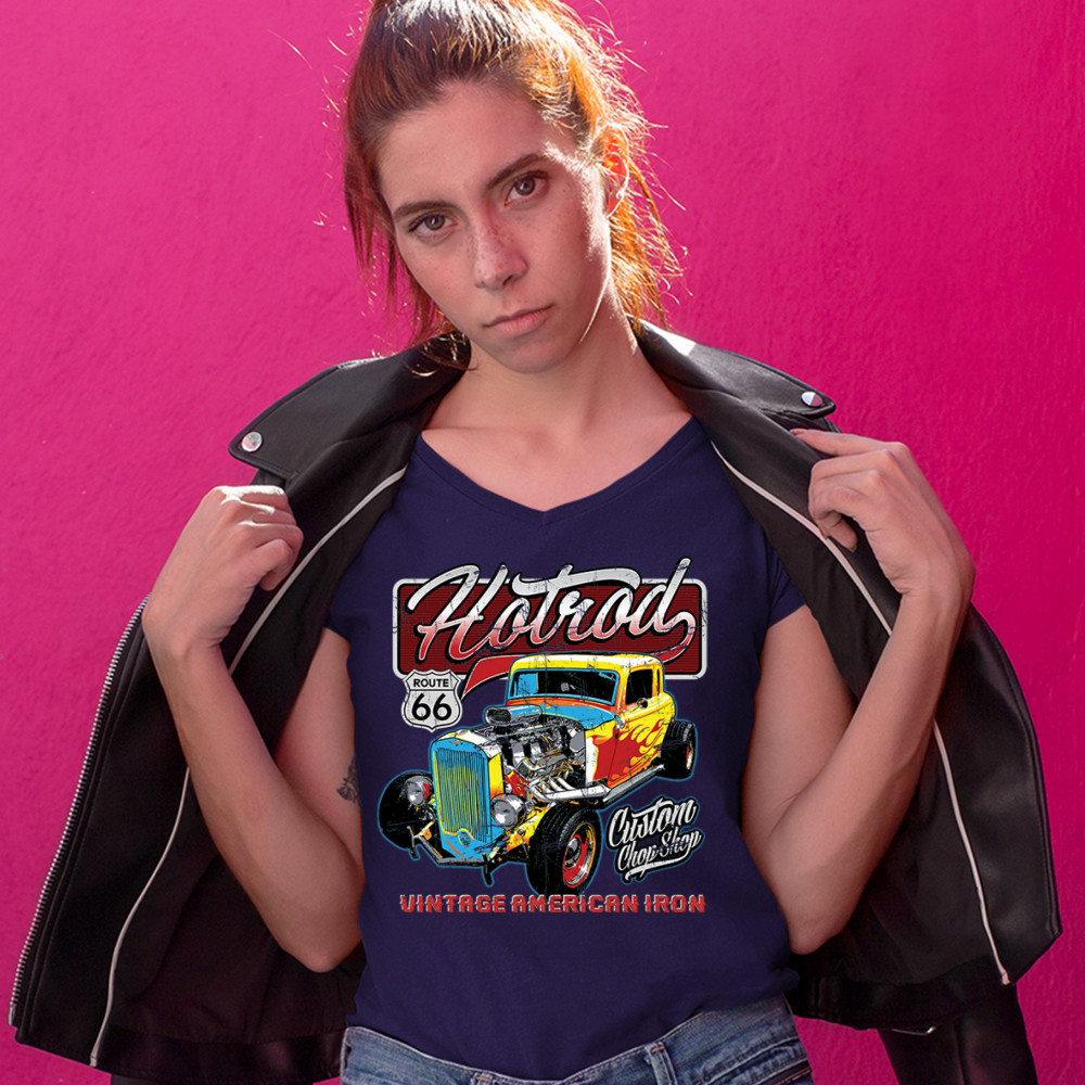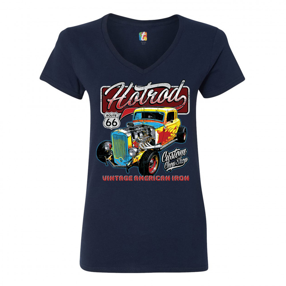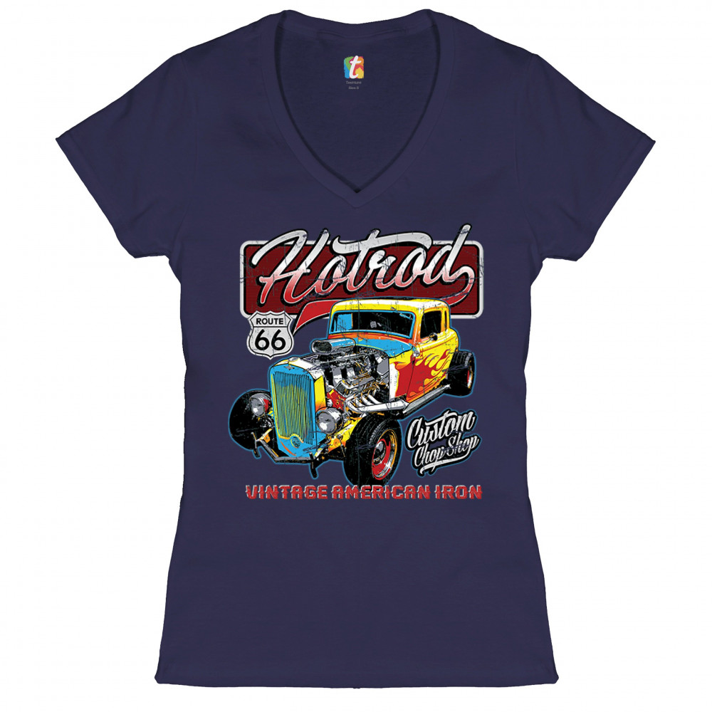VINTAGE AMERICAN IRON women's v-neck t-shirt hot rod route 66 retro racing tee navy blue
