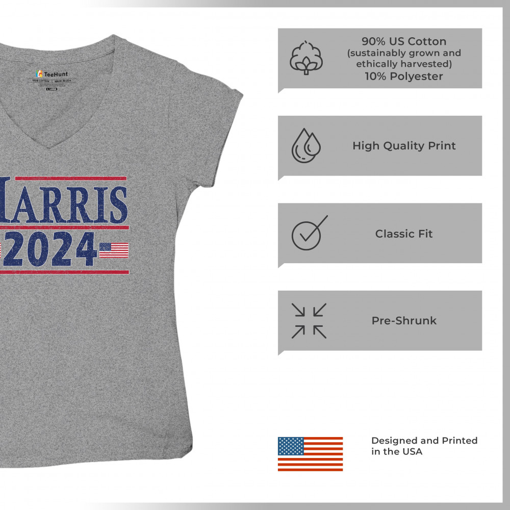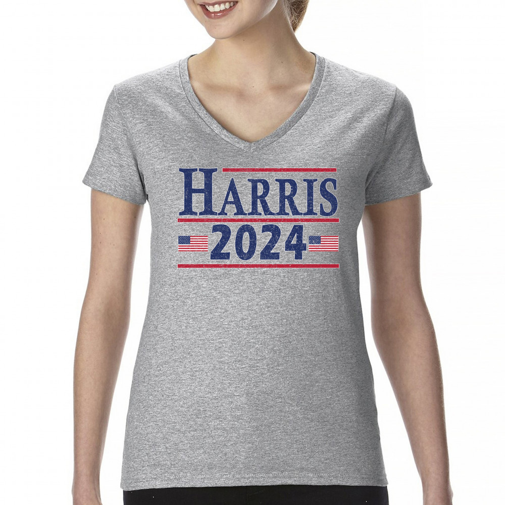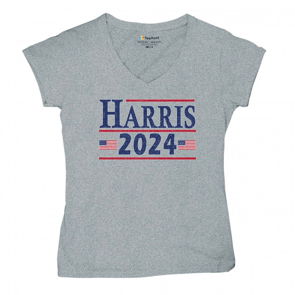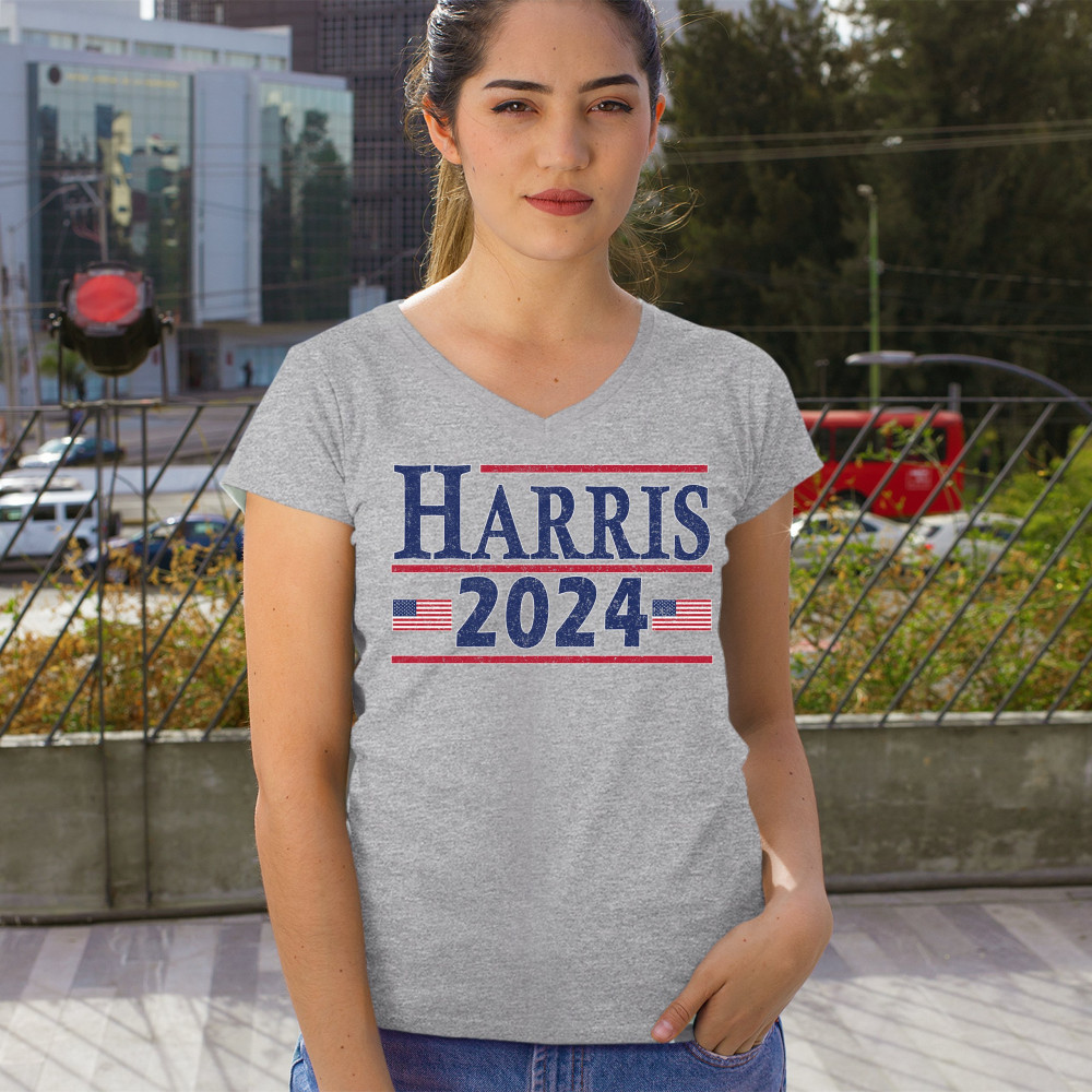 Show your support for Kamala Harris with this bold "Harris 2024" t-shirt, featuring American flags. Perfect for rallies and events. Join the movement today!