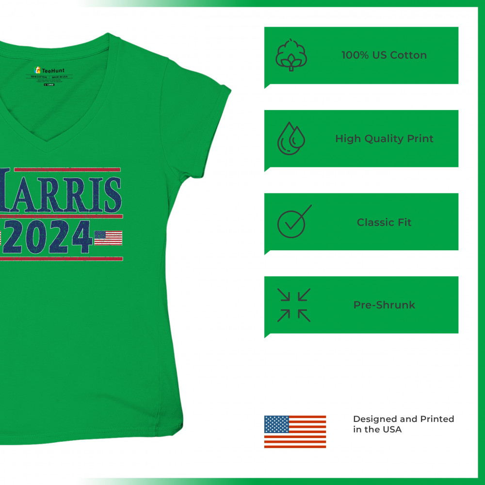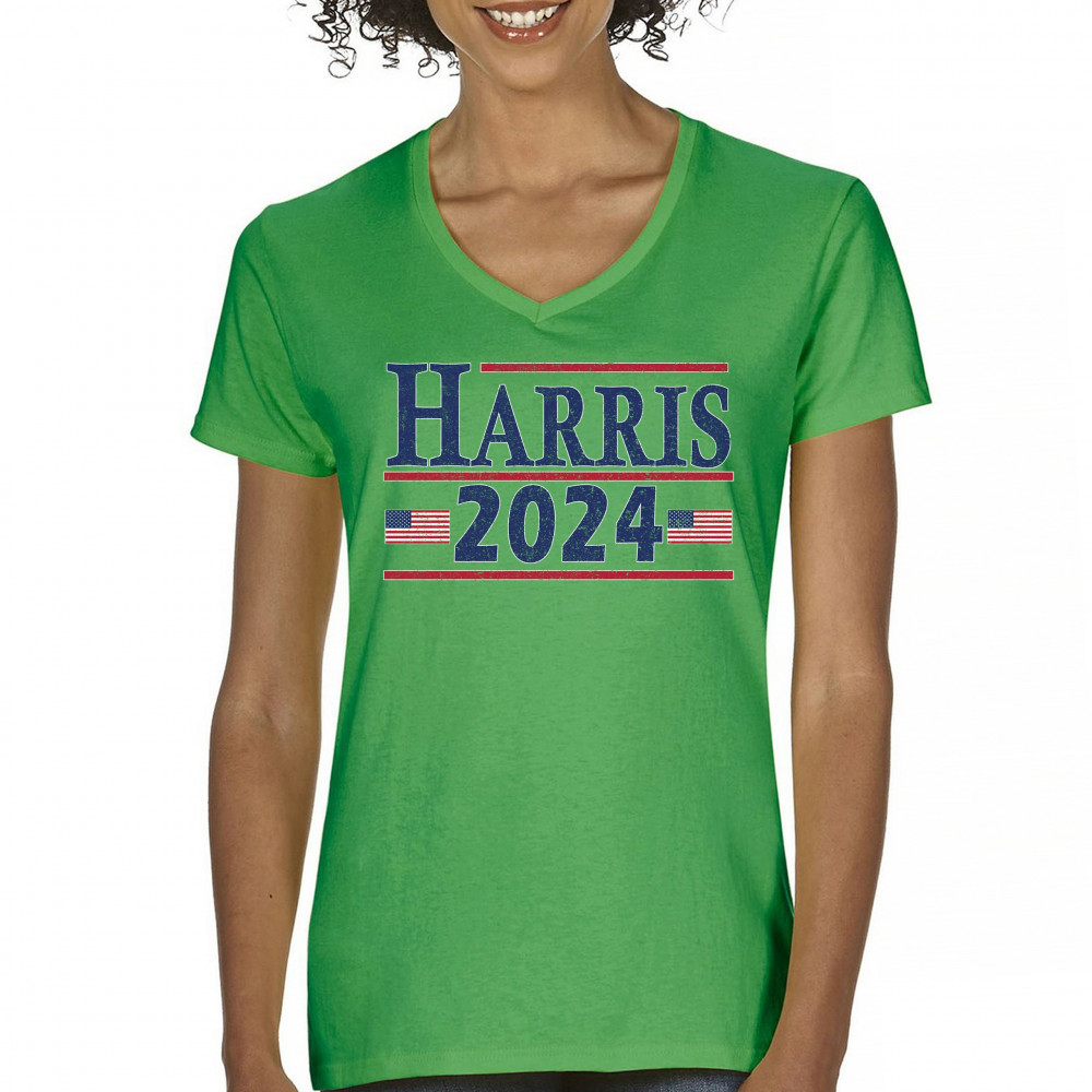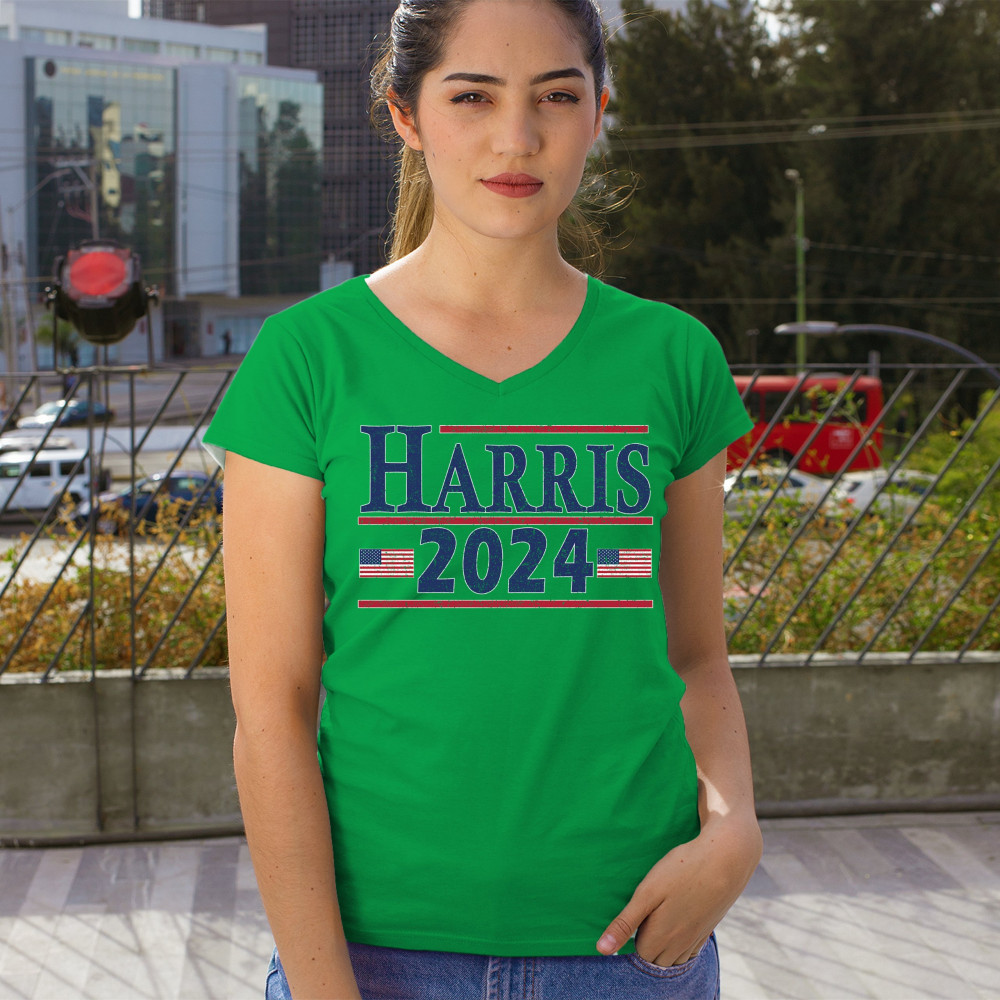 Show your support for Kamala Harris with this bold "Harris 2024" t-shirt, featuring American flags. Perfect for rallies and events. Join the movement today!