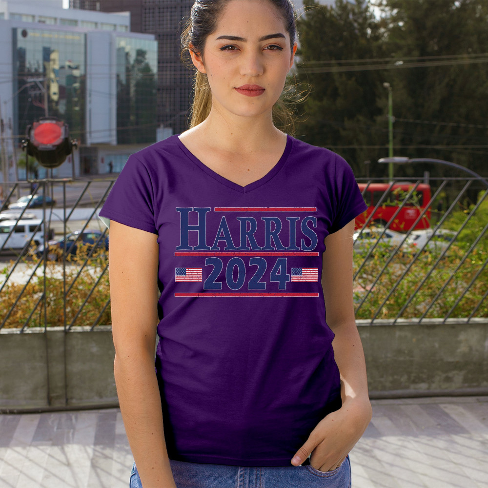 Show your support for Kamala Harris with this bold "Harris 2024" t-shirt, featuring American flags. Perfect for rallies and events. Join the movement today!