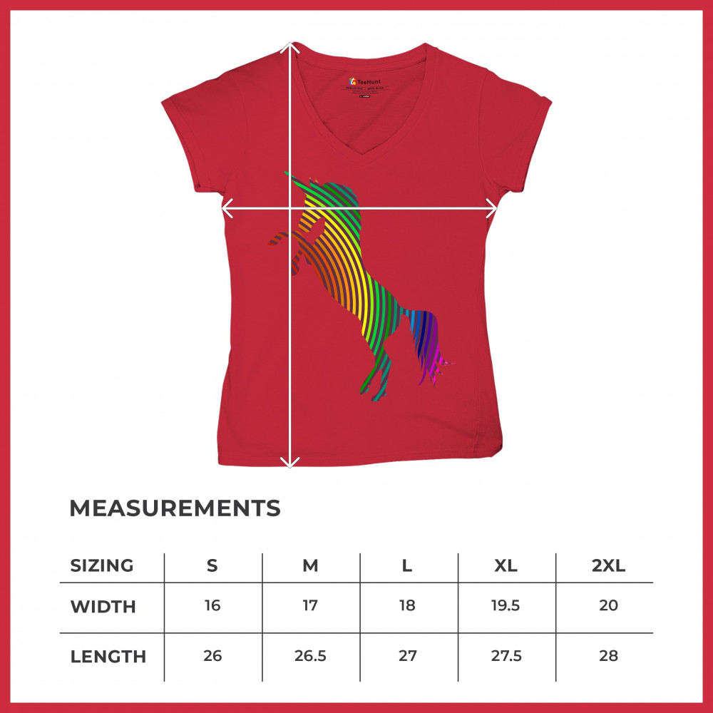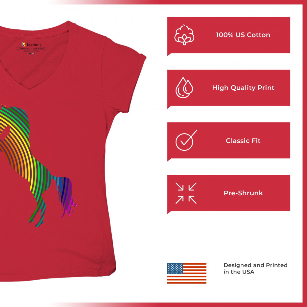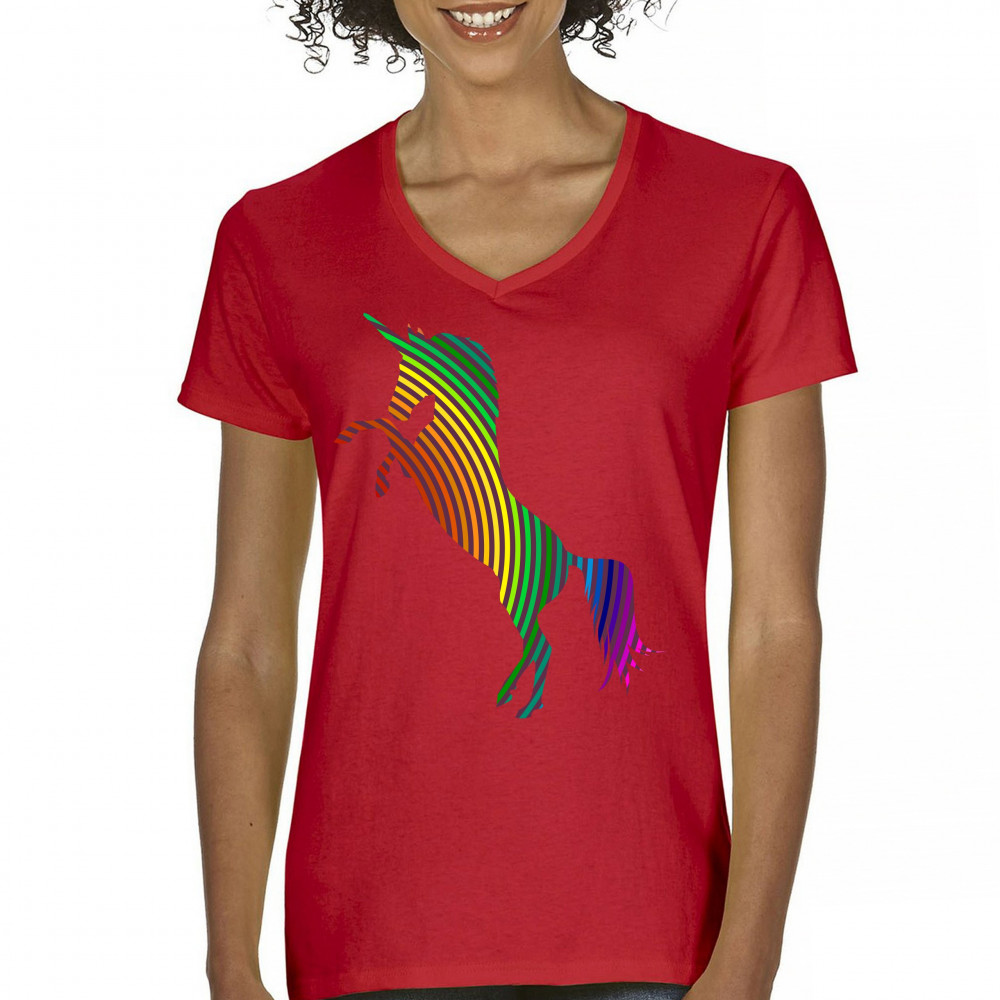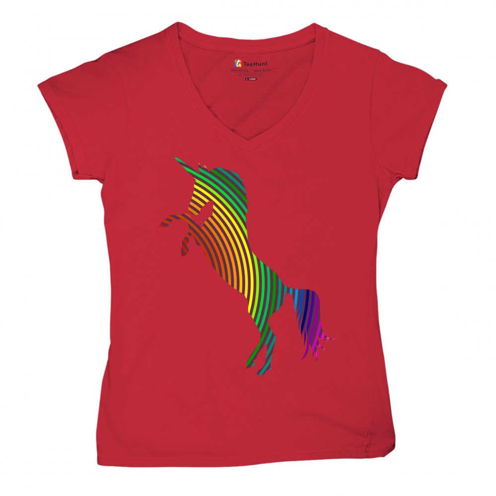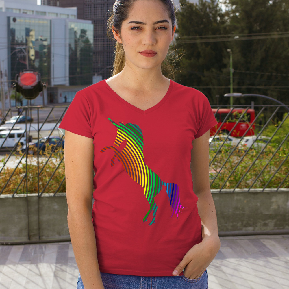 VIVID RAINBOW-STRIPE REARING unicorn women's v-neck t-shirt lgbt gay pride tee red