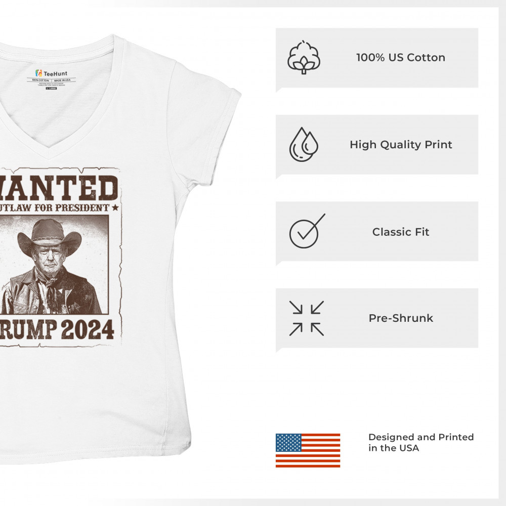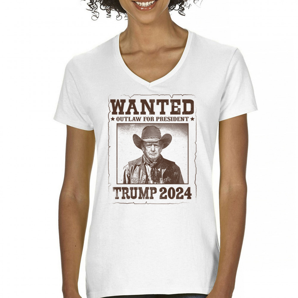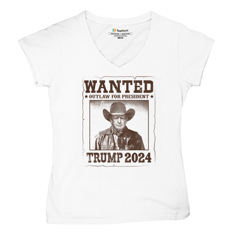 Bold "Wanted: Outlaw for President" design featuring Trump in cowboy attire, perfect for rally-goers and supporters. Express your support for the 2024 election.
