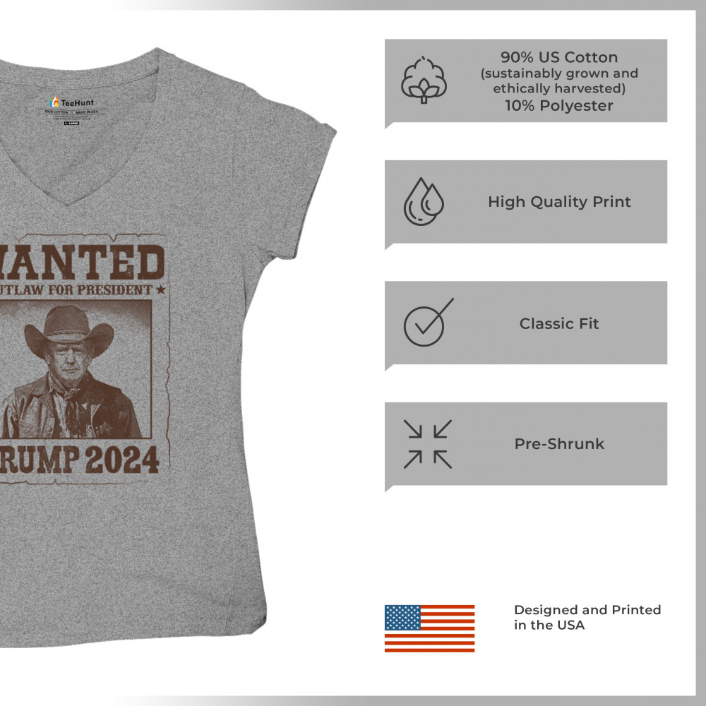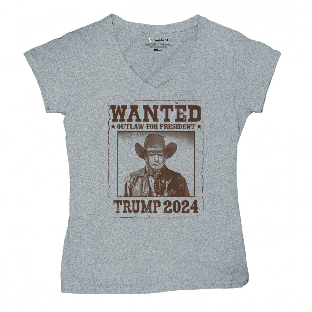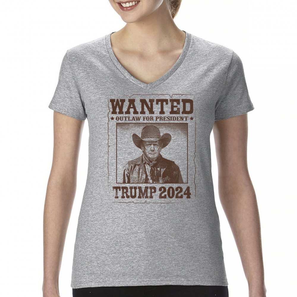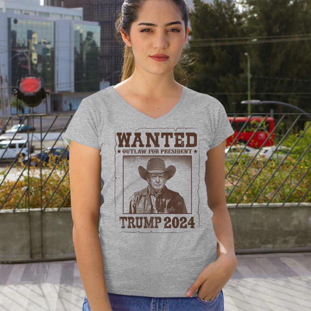 Bold "Wanted: Outlaw for President" design featuring Trump in cowboy attire, perfect for rally-goers and supporters. Express your support for the 2024 election.