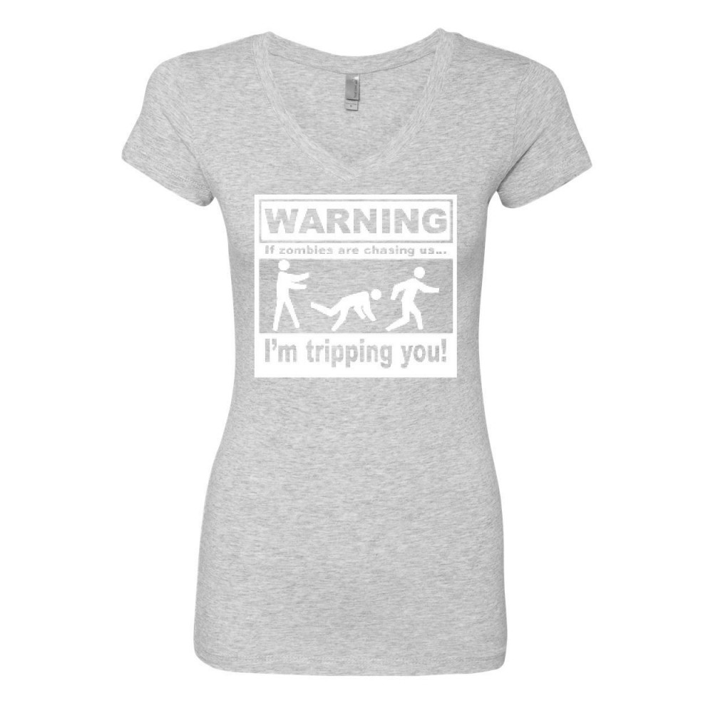 WARNING IF ZOMBIES ARE CHASING US I'M TRIPPING YOU v-neck t-shirt 0 gray