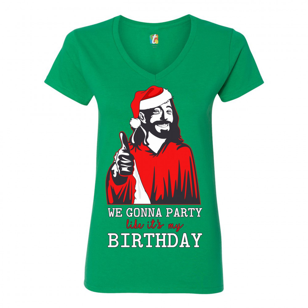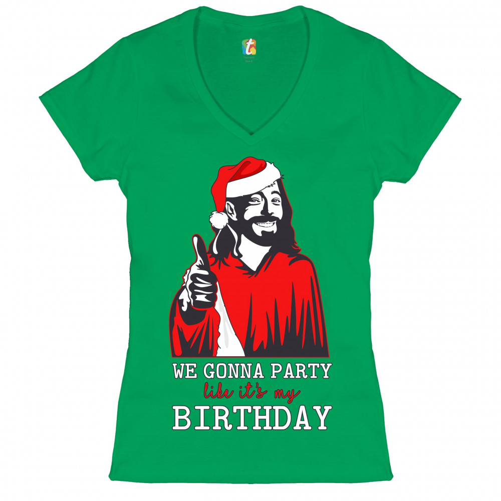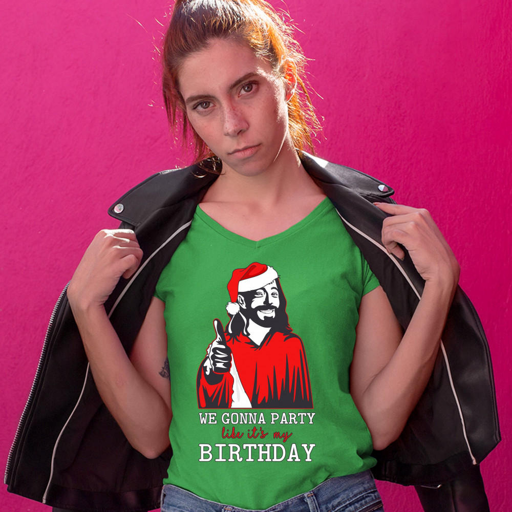 WE GONNA PARTY LIKE IT'S MY BIRTHDAY women's v-neck t-shirt jesus christ tee green