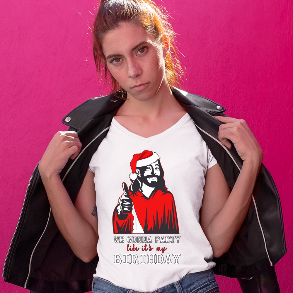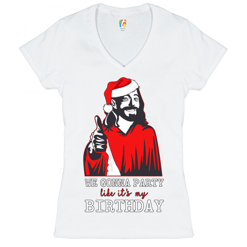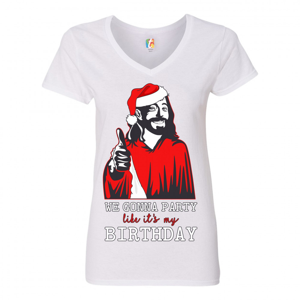 WE GONNA PARTY LIKE IT'S MY BIRTHDAY women's v-neck t-shirt jesus christ tee white