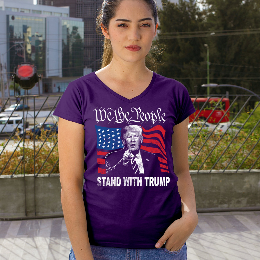Express your allegiance to President Trump with the "We the People Stand with Trump" design. This compelling design showcases a determined Trump pointing forward, set against the iconic American flag, symbolizing strength and patriotism. It's a perfect choice for rallies and gatherings, proudly representing conservative values and the fight against leftist agendas. Stand up for America's future and make a statement with this design, supporting the principles of freedom and democracy. An essential addition for any Trump supporter dedicated to the conservative cause.