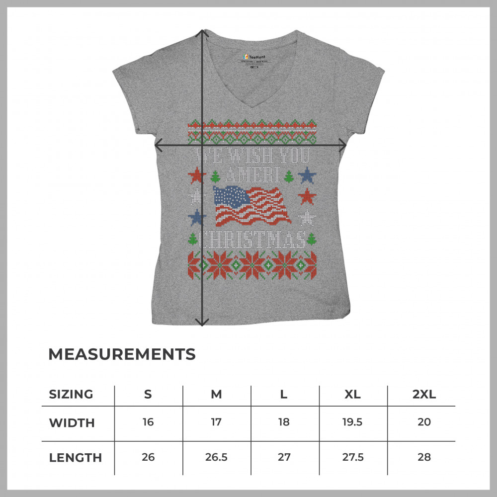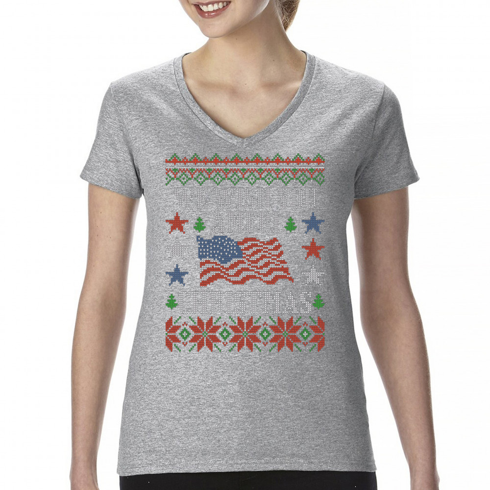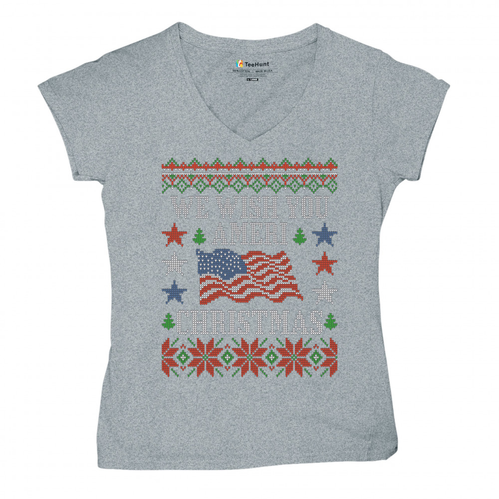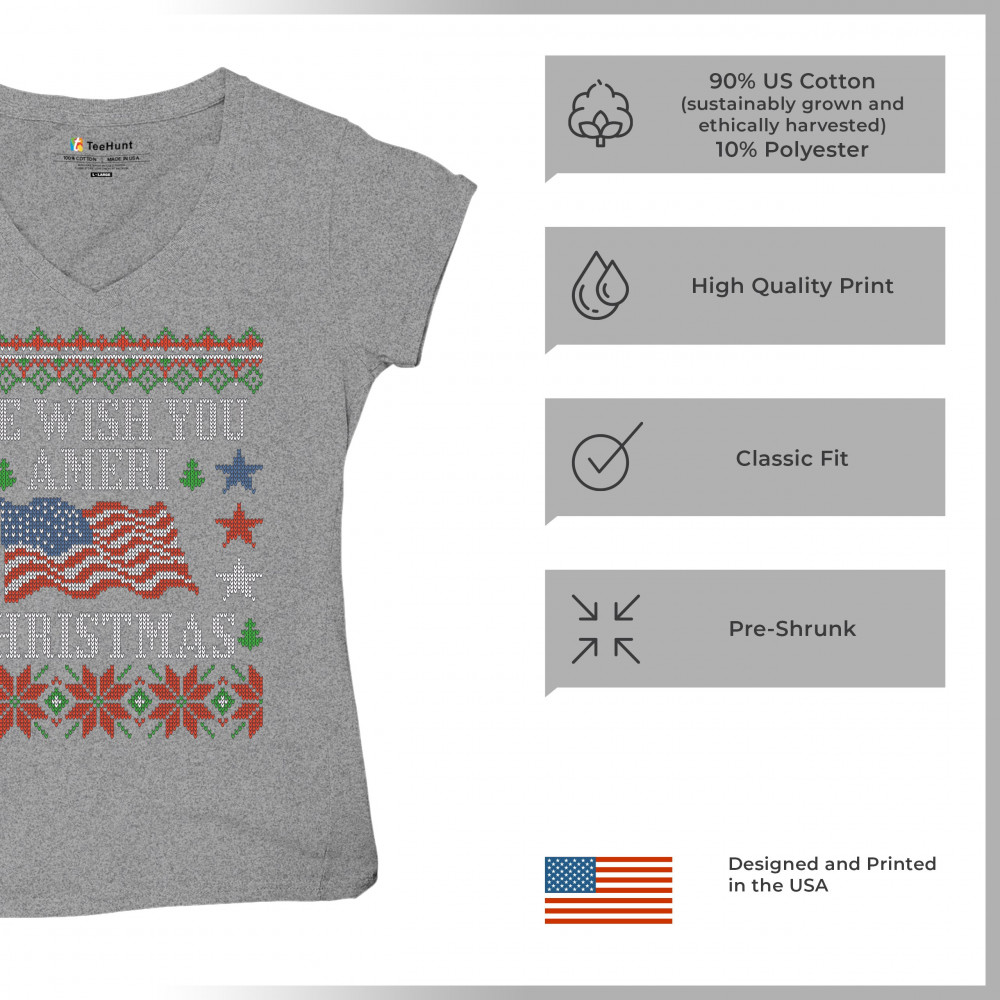 WE WISH YOU AMERI CHRISTMAS women's v-neck t-shirt ugly sweater patriotic tee gray