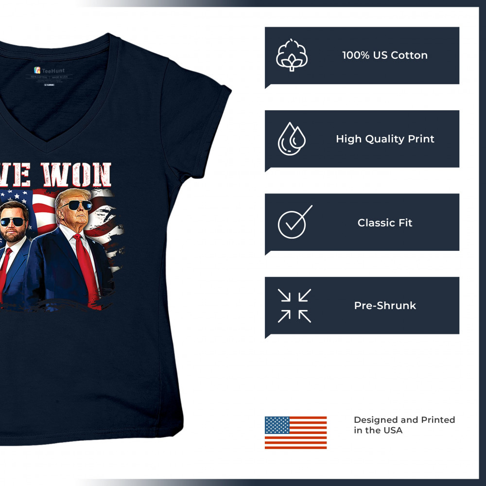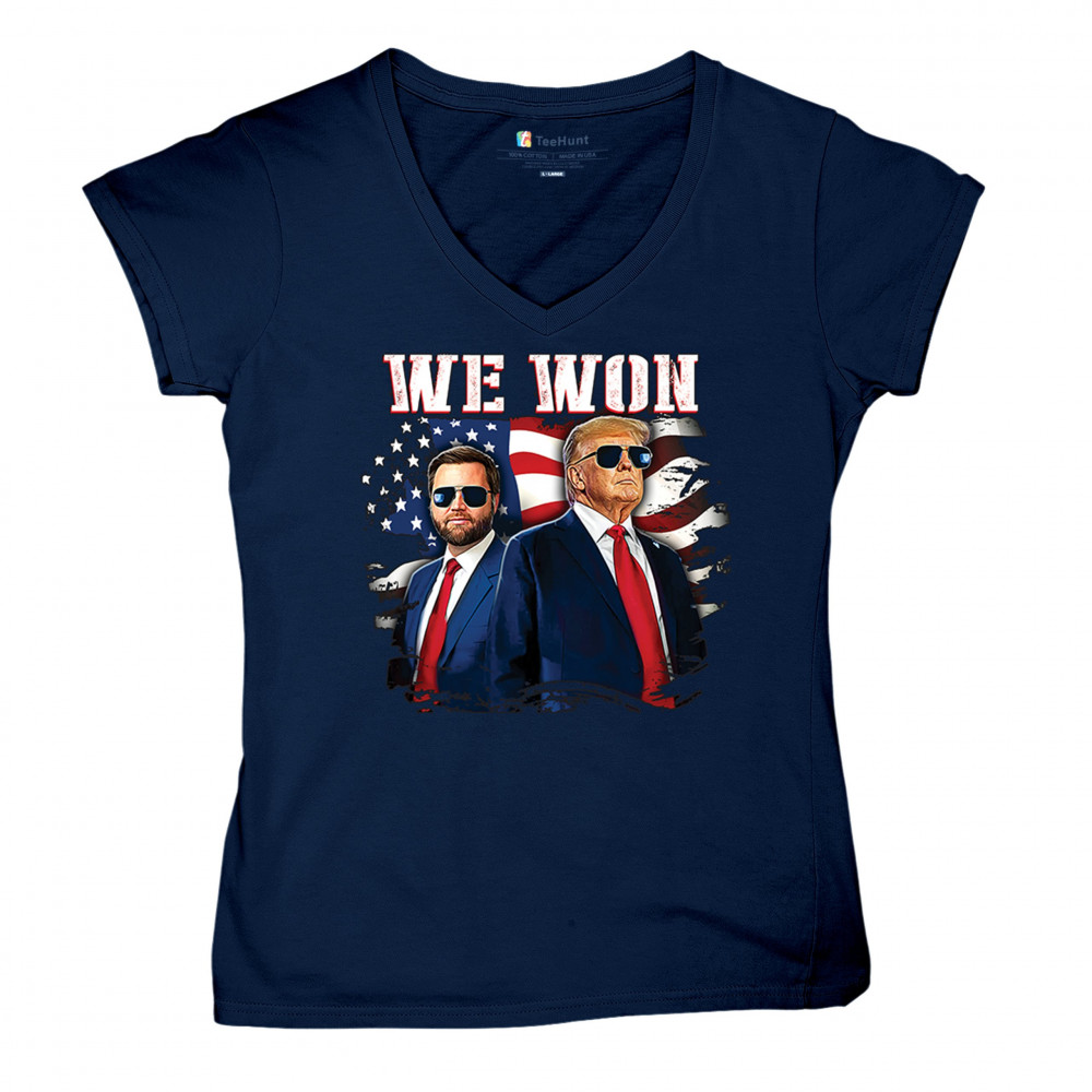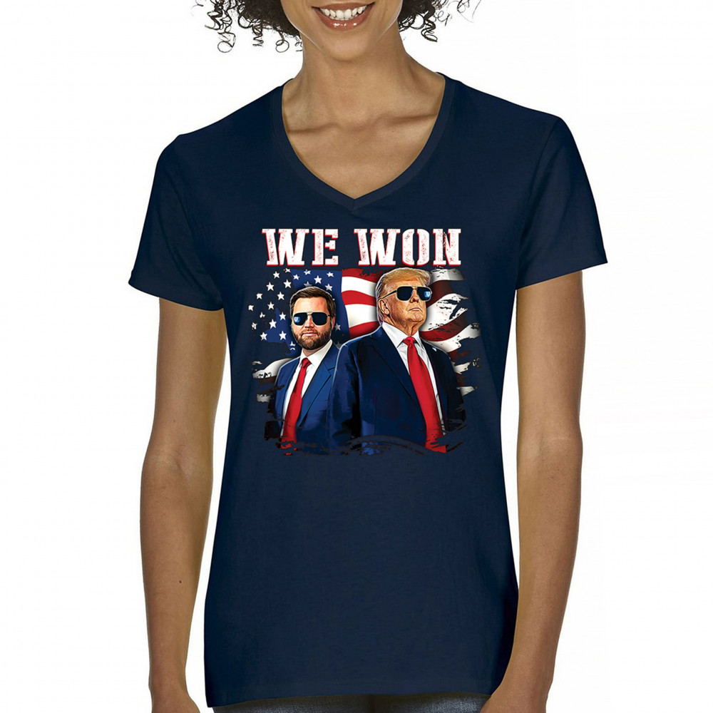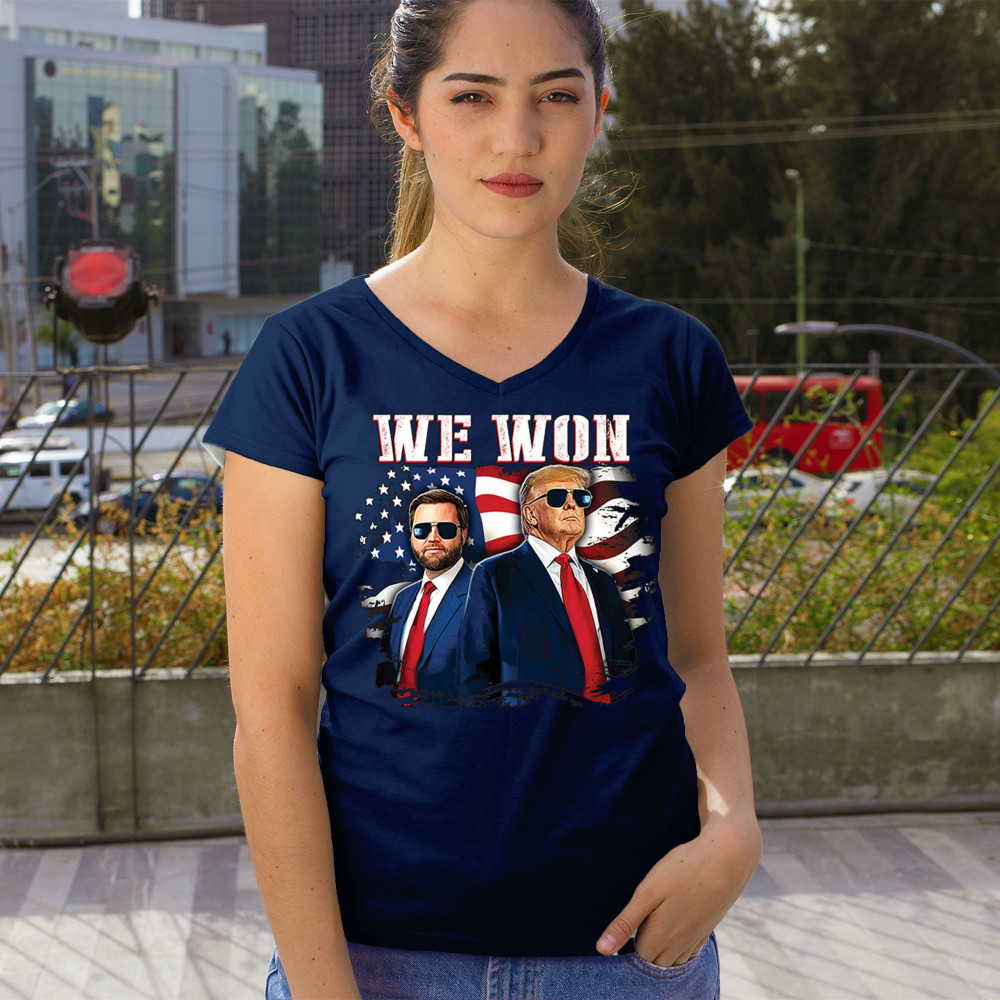 Celebrate Republican victory with this bold "We Won" design featuring Trump and patriotic flair—perfect for rallies, events, and patriotic pride.