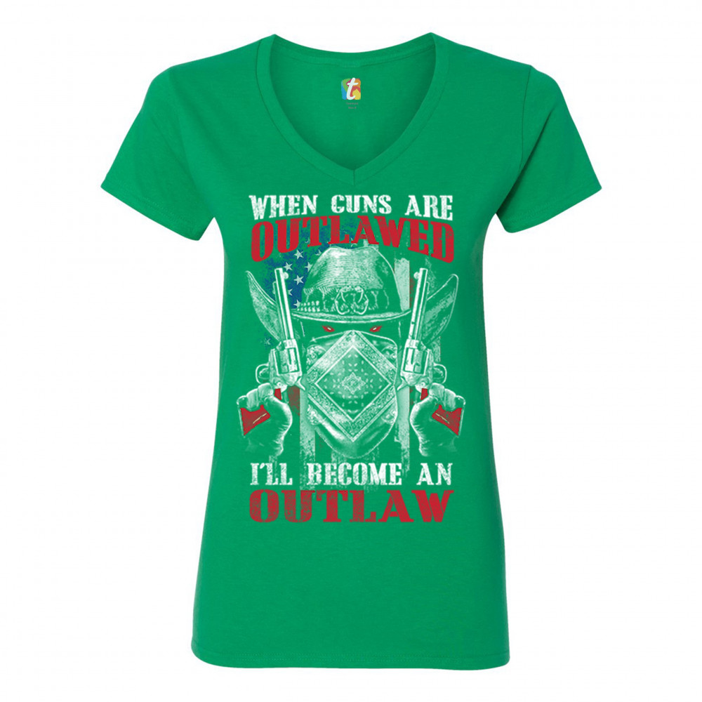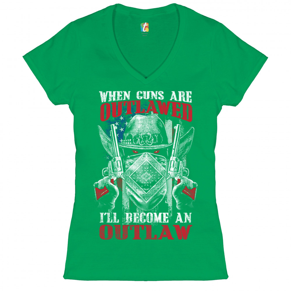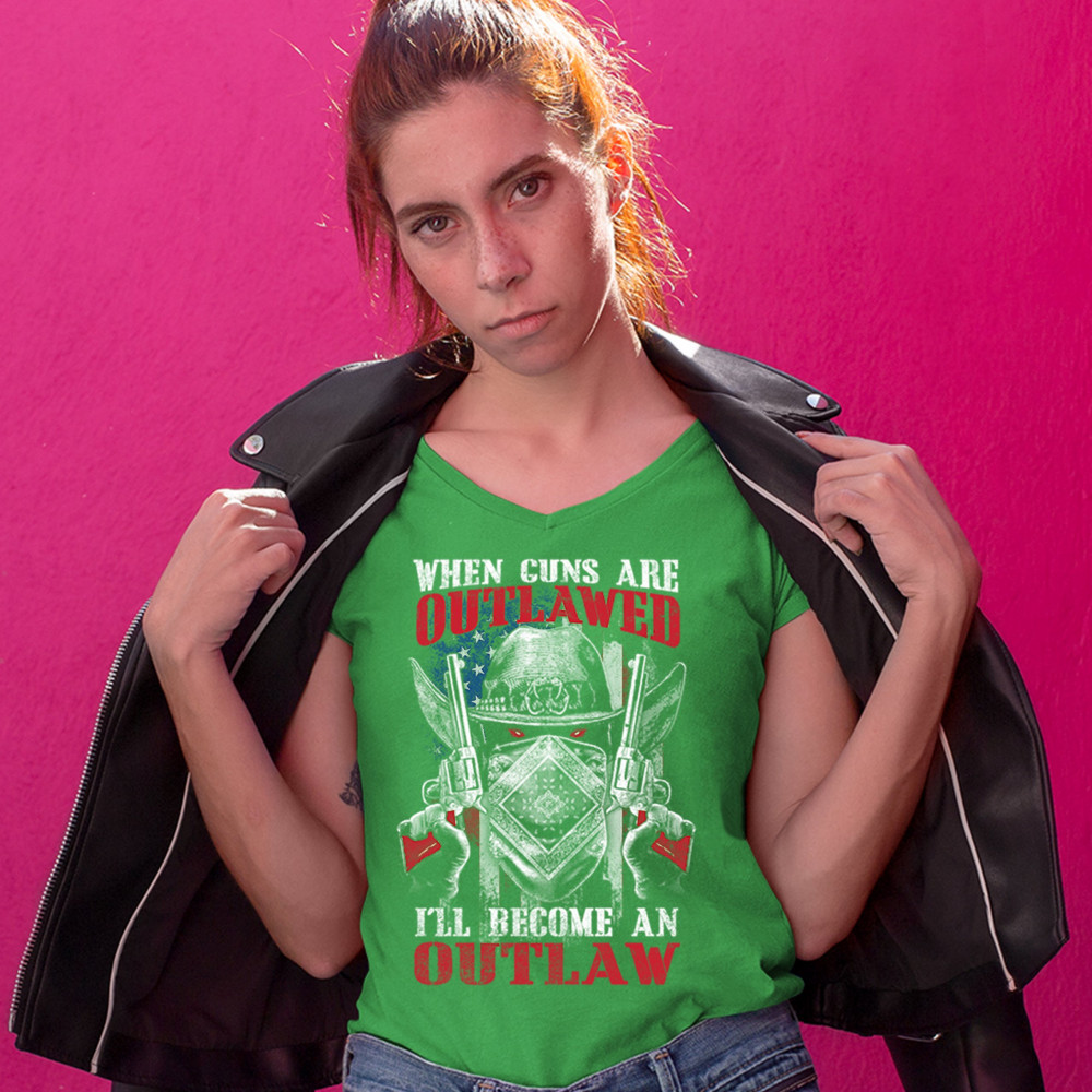 A print featuring a head wearing a cowboy hat and a bandana which covers most of the face, leaving only the red eyes to be seen. In each hand the person is holding a revoler and in the background there is the American flag. The print says: "When Guns Are