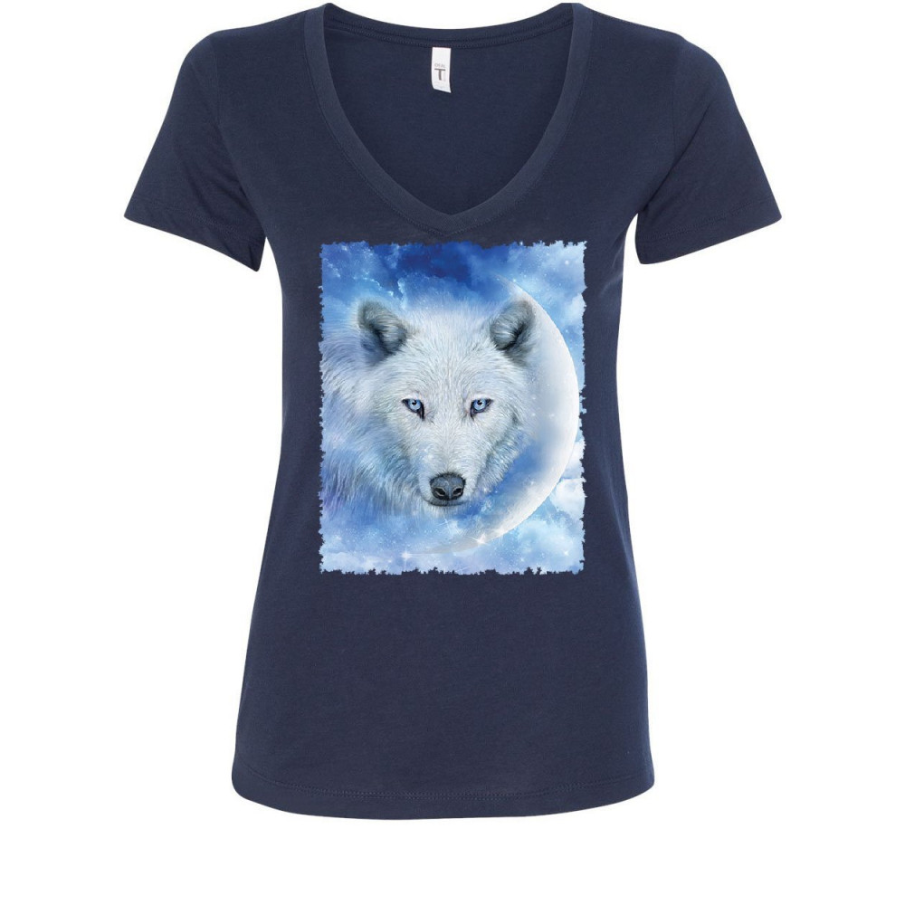 WHITE WOLF women's v-neck t-shirt wildlife animal moon howl nature wolfpack navy blue