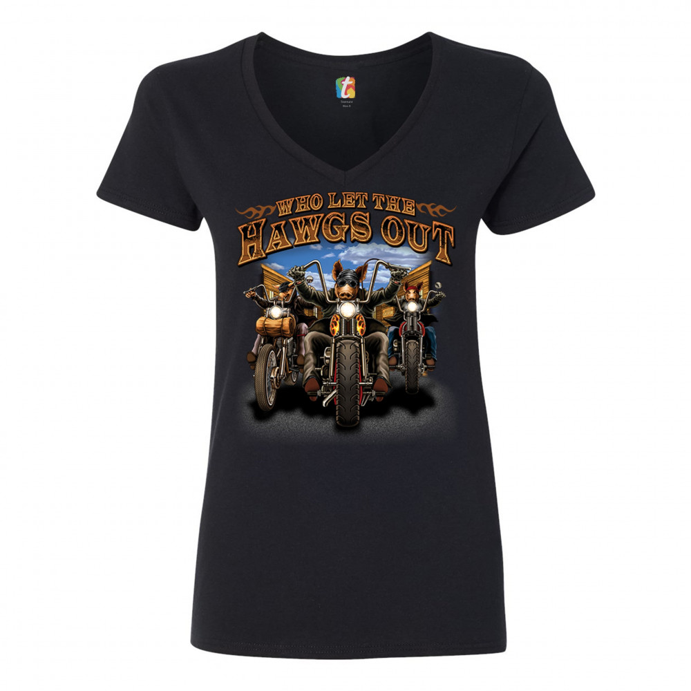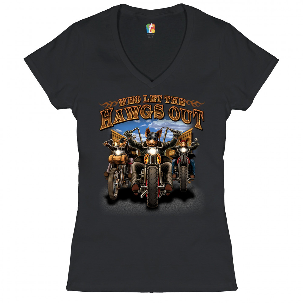 WHO LET THE HAWGS OUT women's v-neck t-shirt biker motorcycle gang mc tee black