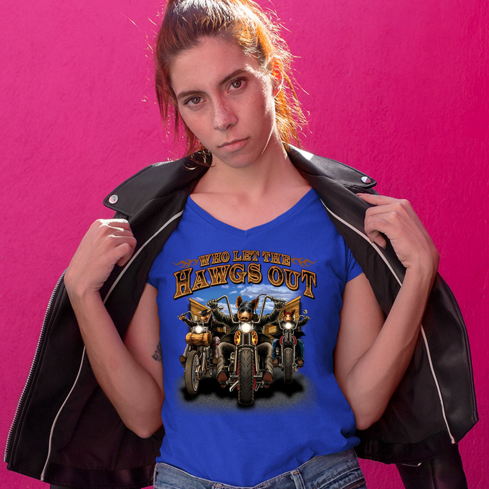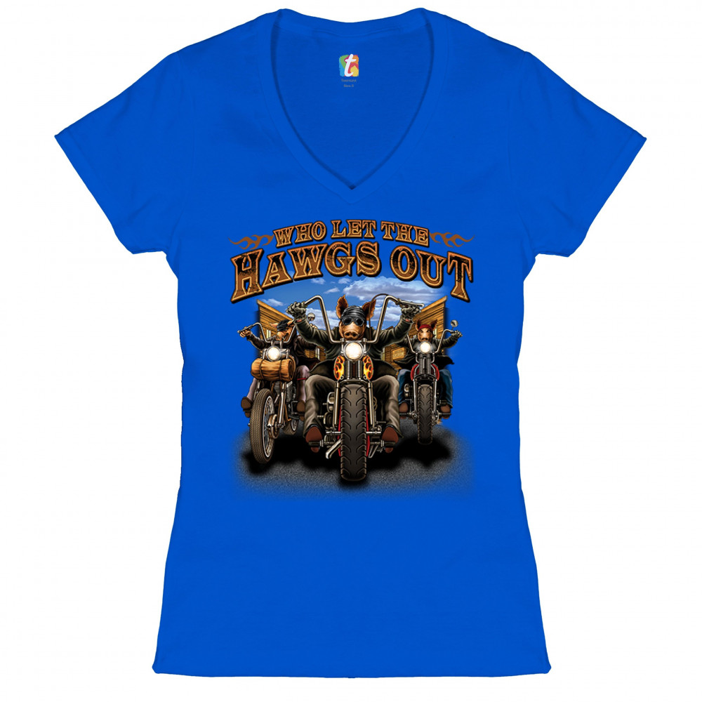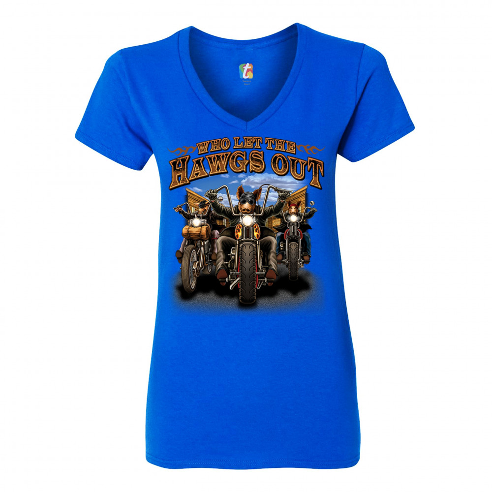 WHO LET THE HAWGS OUT women's v-neck t-shirt biker motorcycle gang mc tee royal blue