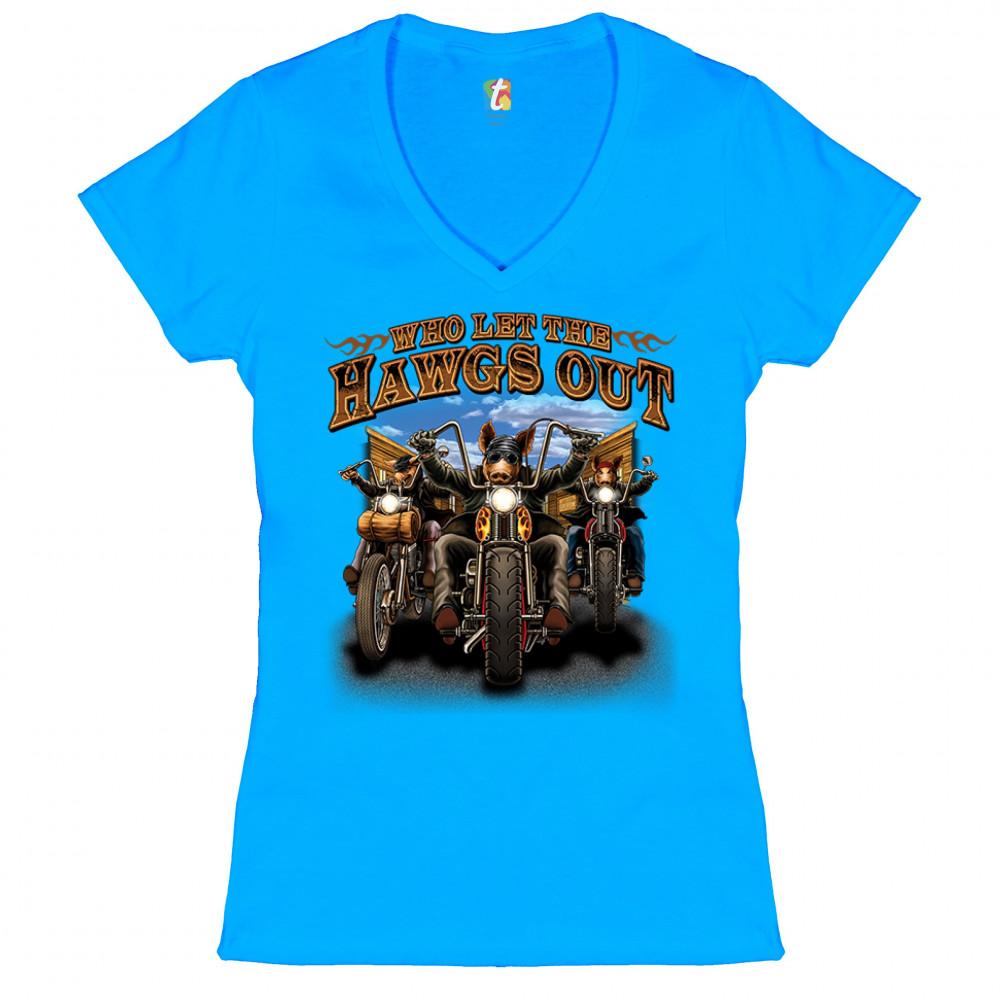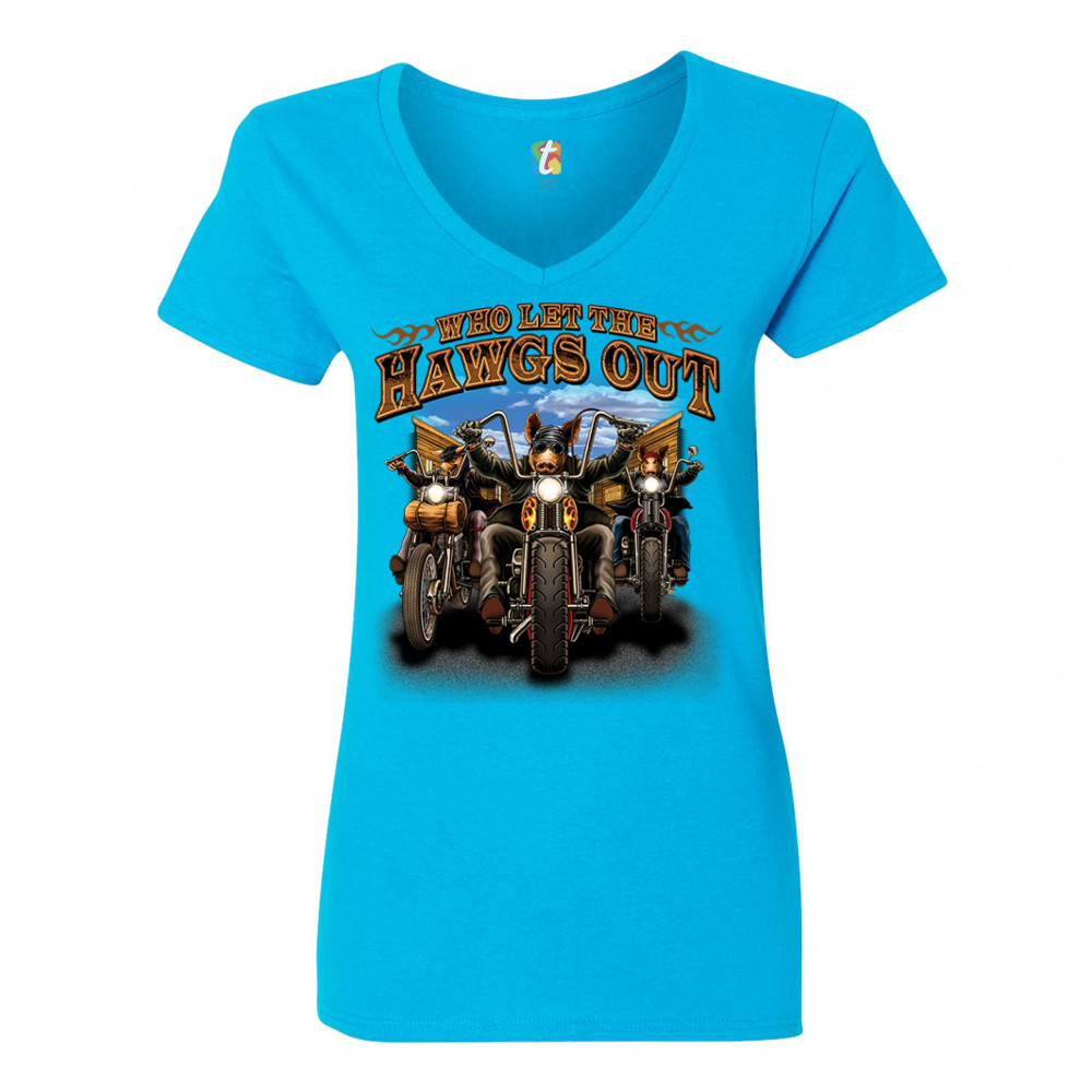 WHO LET THE HAWGS OUT women's v-neck t-shirt biker motorcycle gang mc tee turquoise