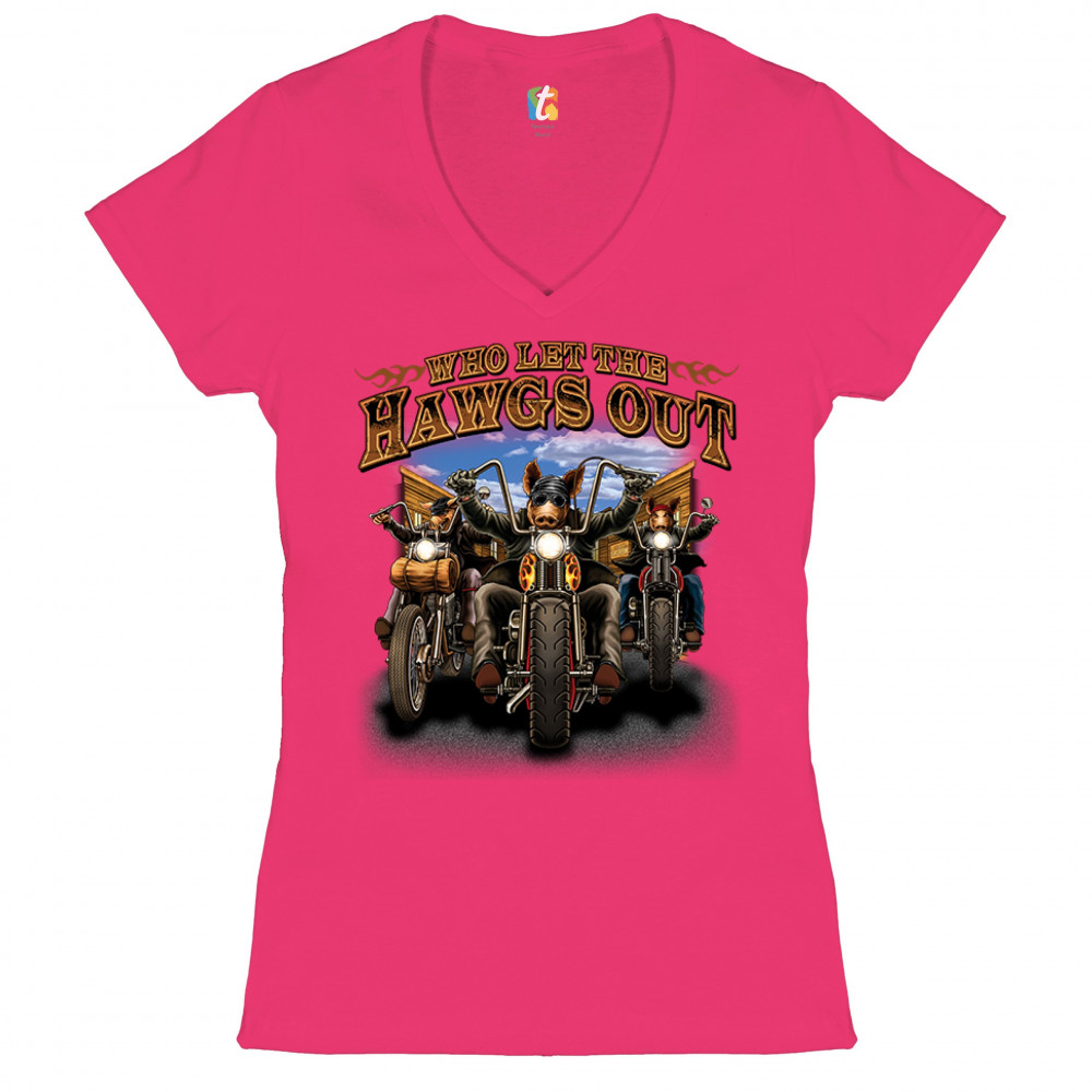 WHO LET THE HAWGS OUT women's v-neck t-shirt biker motorcycle gang mc tee pink