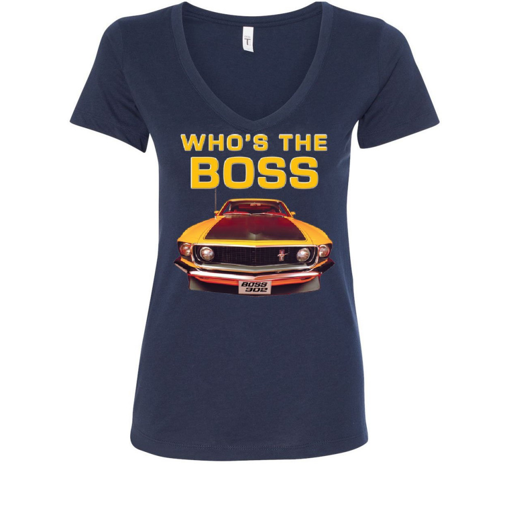 WHO'S THE BOSS? women's v-neck t-shirt ford mustang boss 302 classic muscle car navy blue