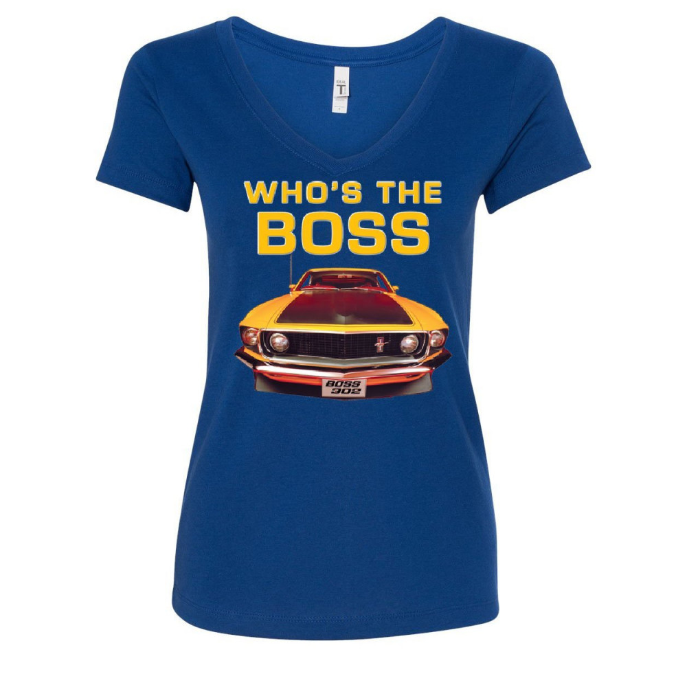 WHO'S THE BOSS? women's v-neck t-shirt ford mustang boss 302 classic muscle car royal blue