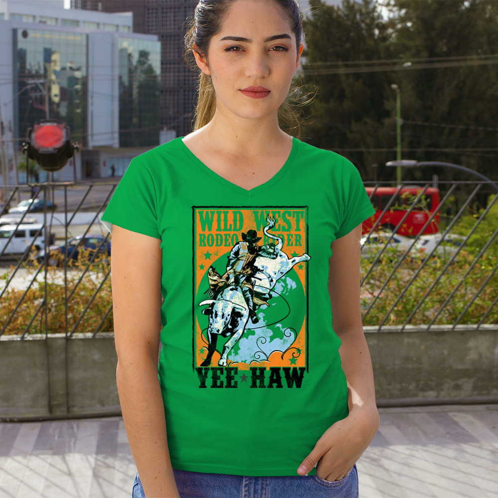 Bold cowboy bull riding design with orange backdrop, perfect for rodeo fans, western events, and country festivals.