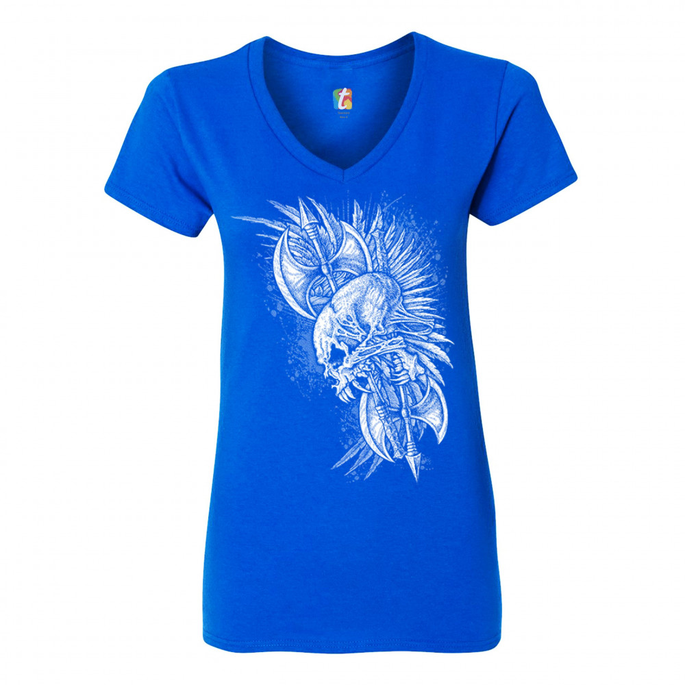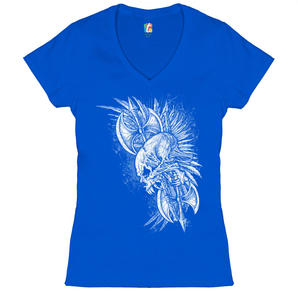 WINGED SKULL women's v-neck t-shirt viking warrior skeleton labrys axe tee royal blue