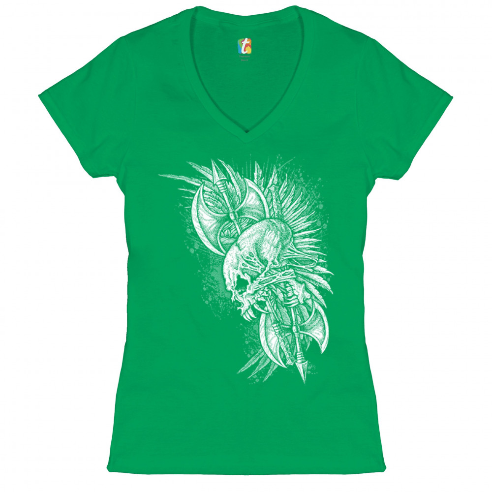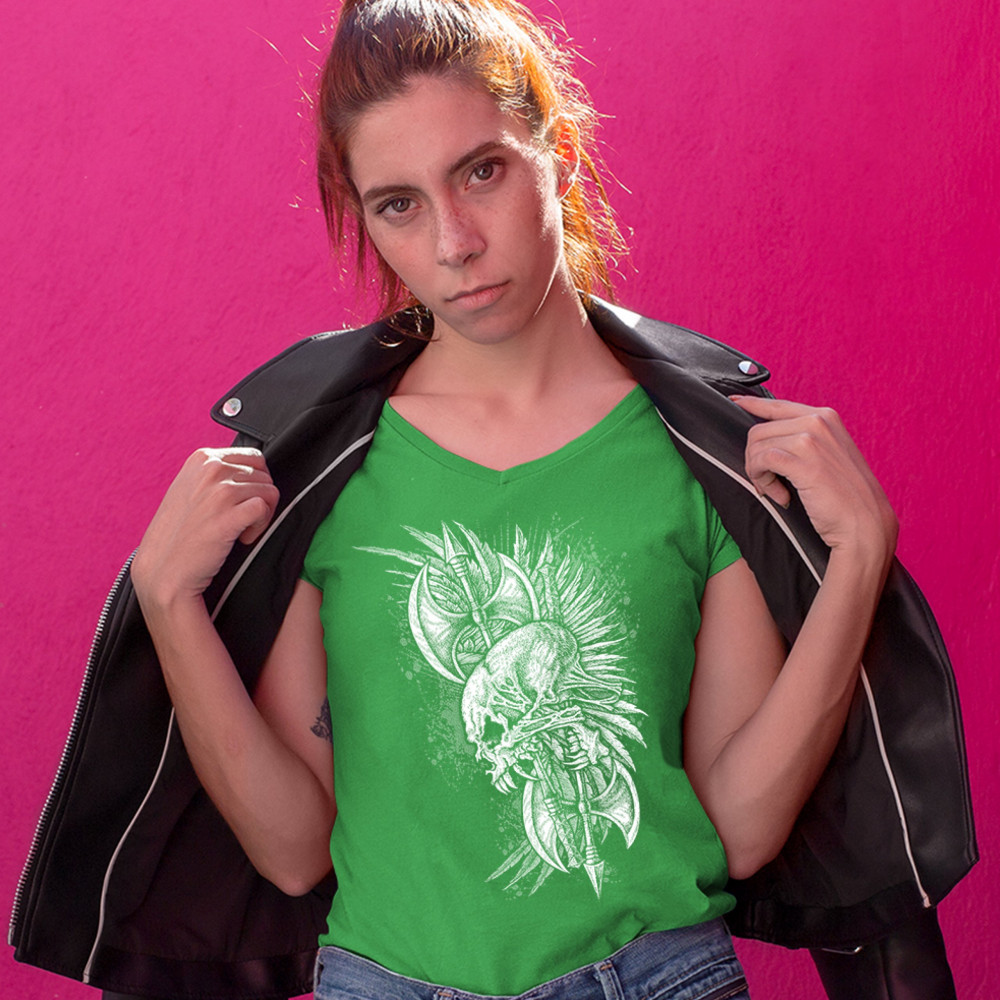 WINGED SKULL women's v-neck t-shirt viking warrior skeleton labrys axe tee green