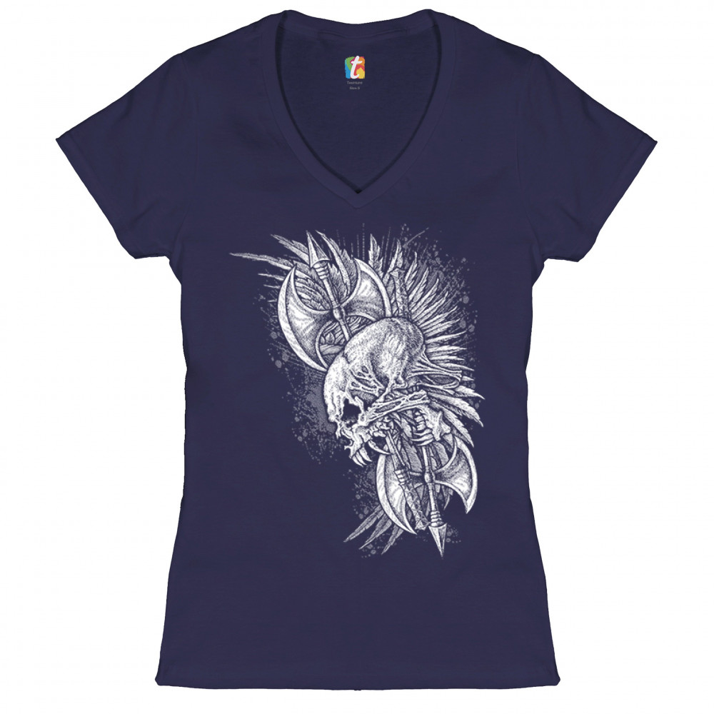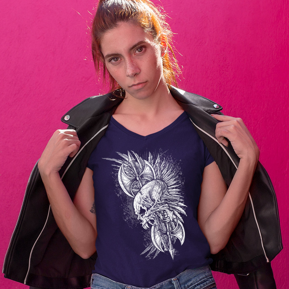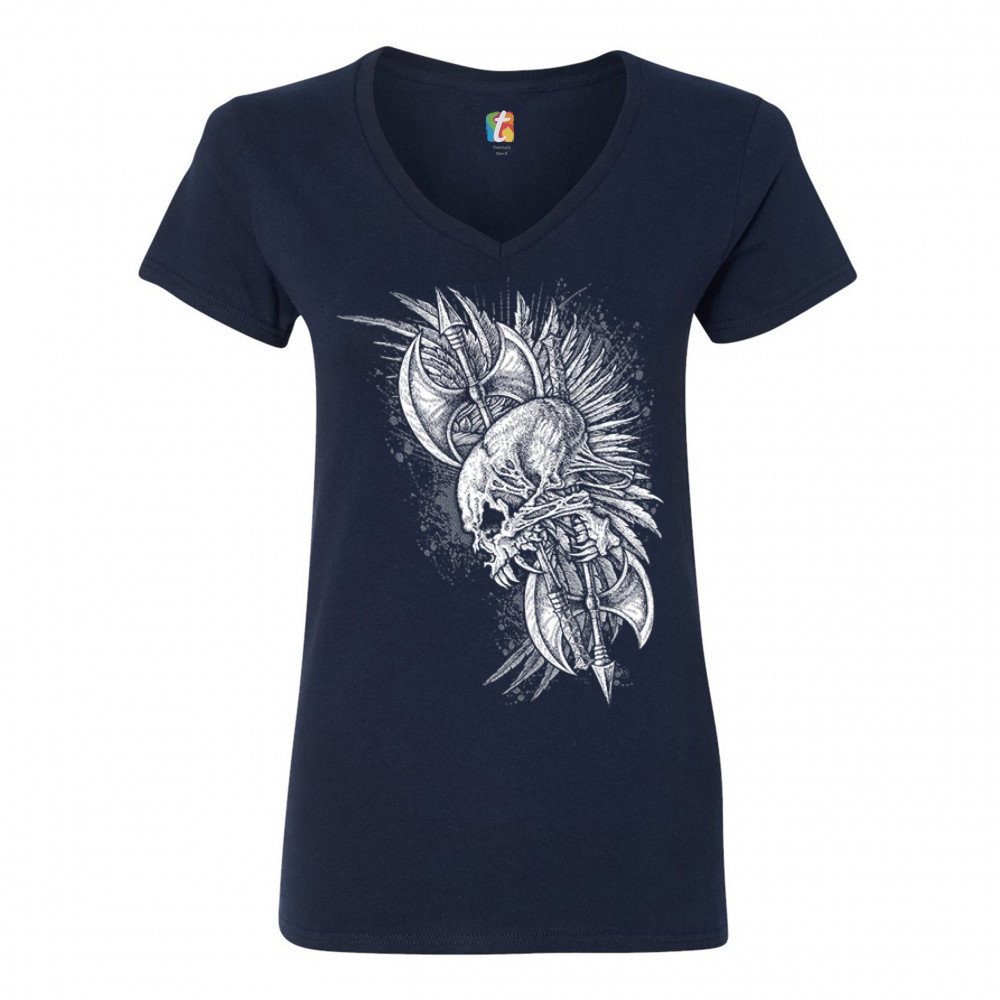 WINGED SKULL women's v-neck t-shirt viking warrior skeleton labrys axe tee navy blue