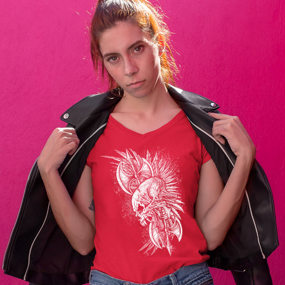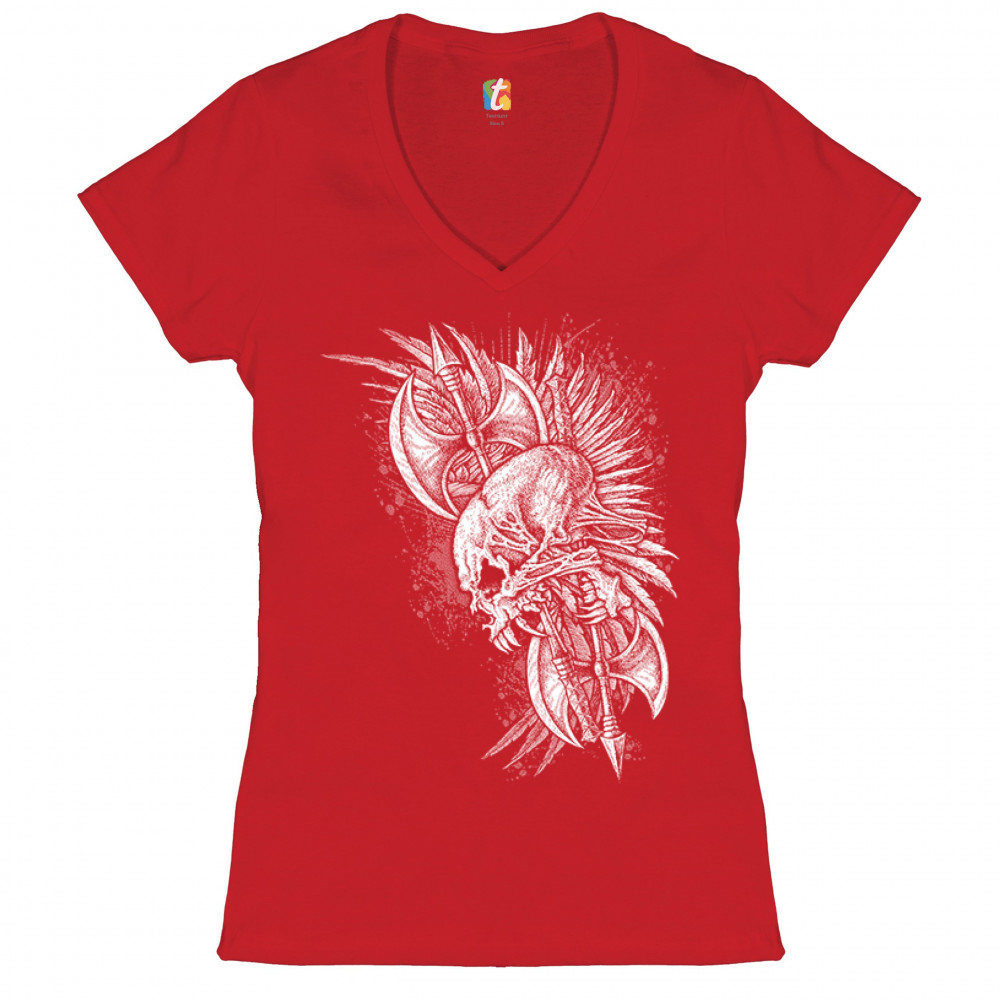 WINGED SKULL women's v-neck t-shirt viking warrior skeleton labrys axe tee red