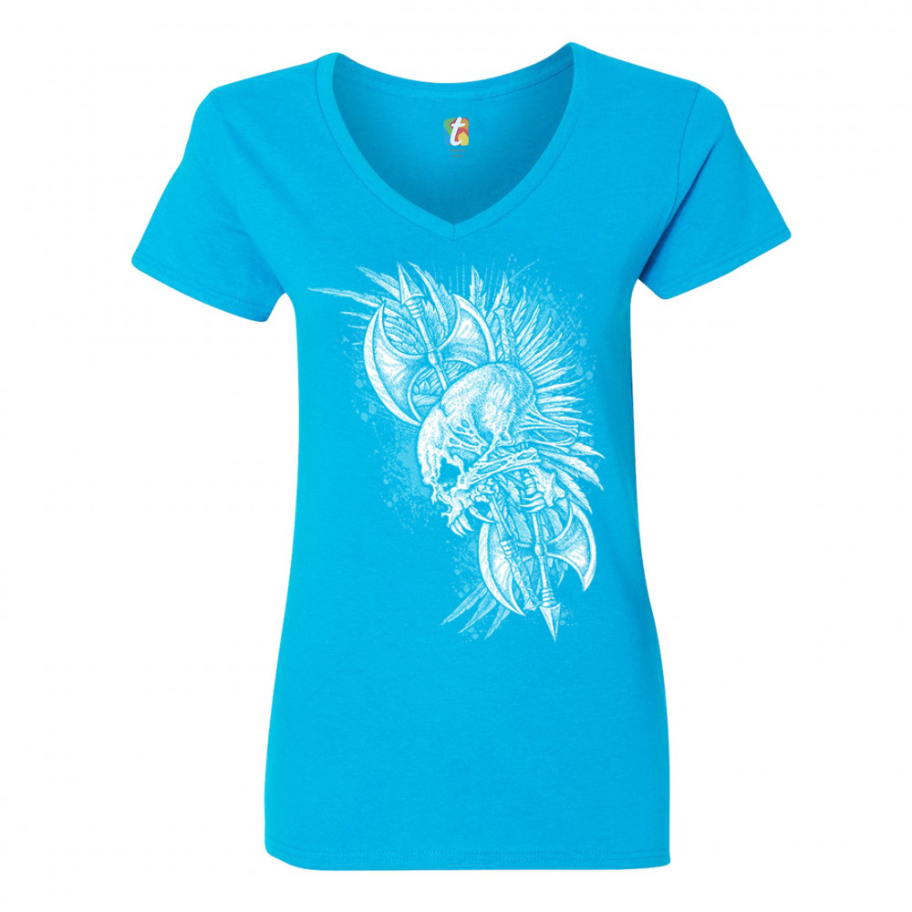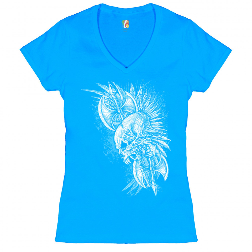 WINGED SKULL women's v-neck t-shirt viking warrior skeleton labrys axe tee turquoise