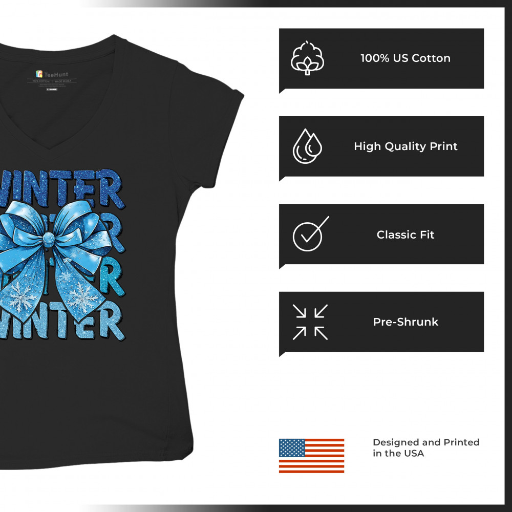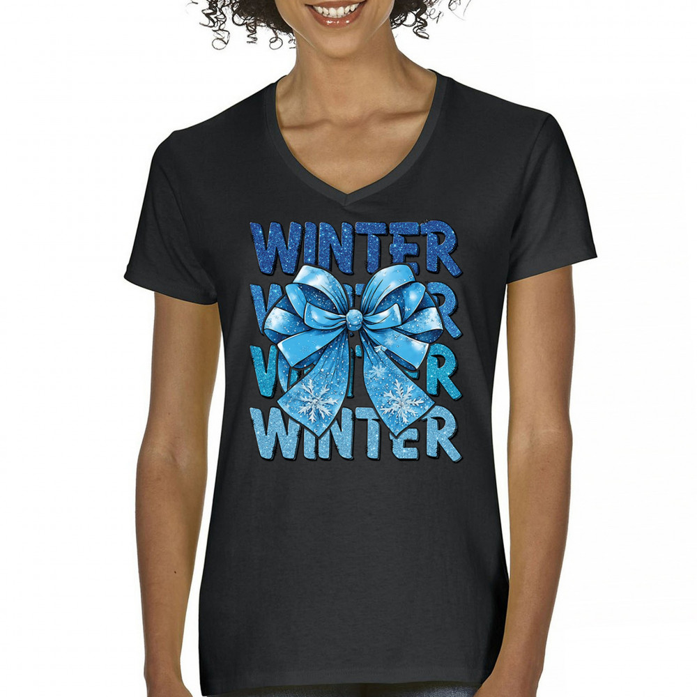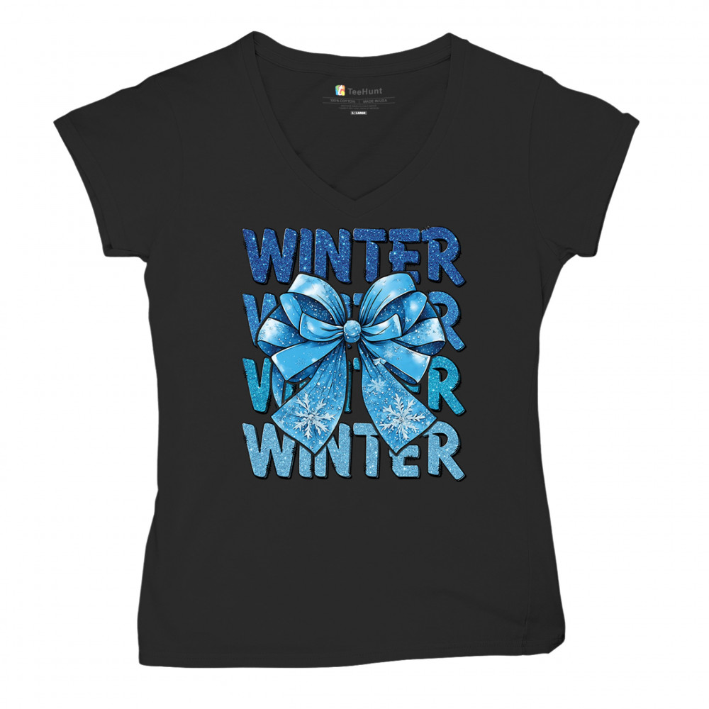 This shimmering winter bow design blends icy blue glitter style with bold repeating WINTER text for a bright seasonal statement. Snowflake accents and frosty tones create a cozy, cheerful vibe perfect for holiday outfits, gifting, or cold-weather lovers. A standout graphic that brings festive winter charm to any wardrobe and boosts seasonal search visibility.