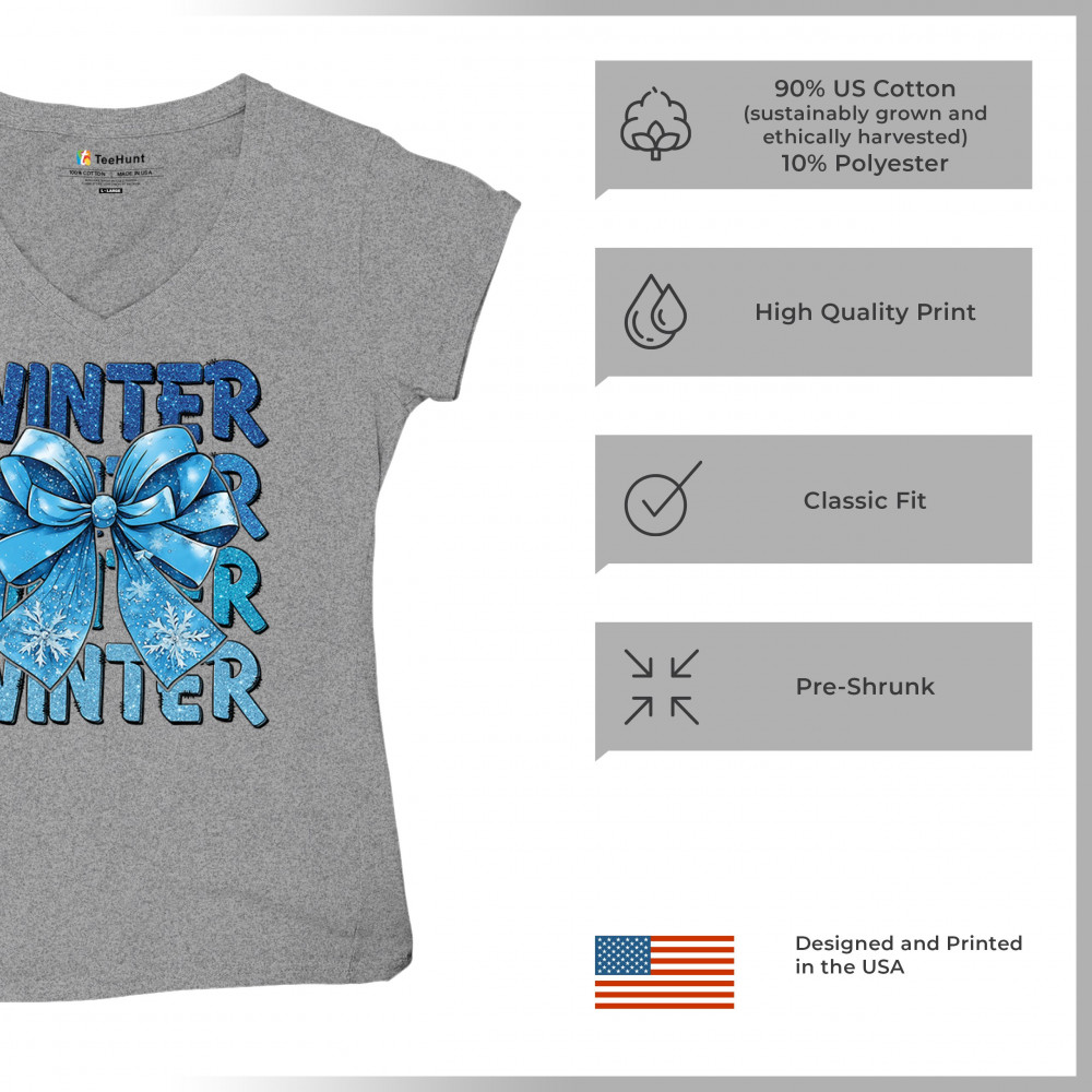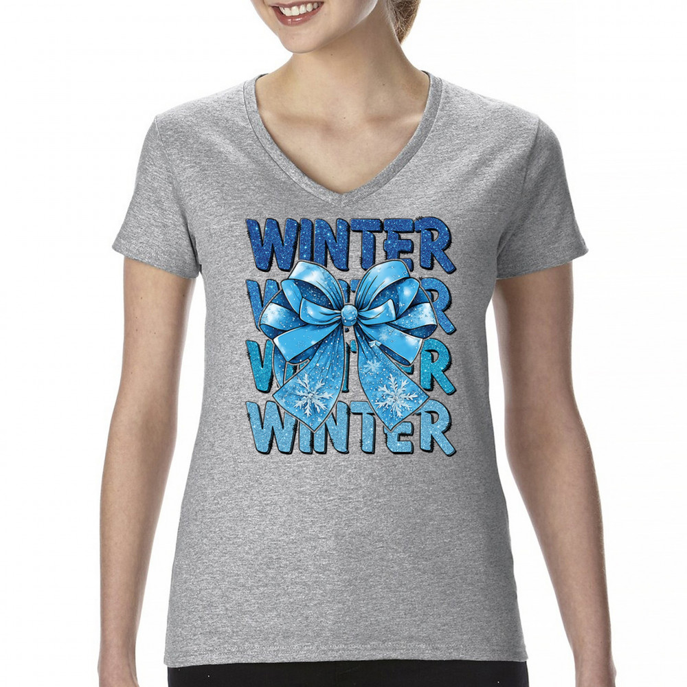 This shimmering winter bow design blends icy blue glitter style with bold repeating WINTER text for a bright seasonal statement. Snowflake accents and frosty tones create a cozy, cheerful vibe perfect for holiday outfits, gifting, or cold-weather lovers. A standout graphic that brings festive winter charm to any wardrobe and boosts seasonal search visibility.
