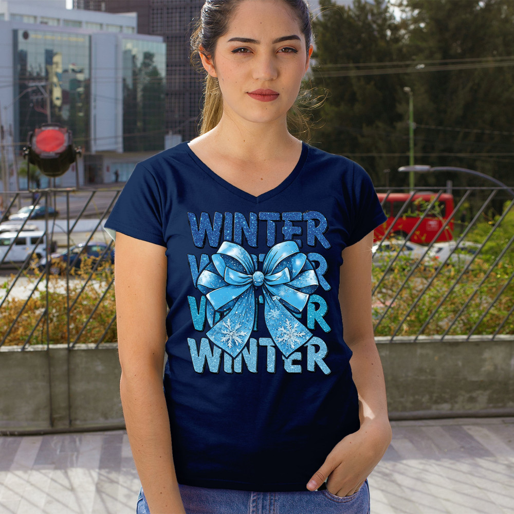 This shimmering winter bow design blends icy blue glitter style with bold repeating WINTER text for a bright seasonal statement. Snowflake accents and frosty tones create a cozy, cheerful vibe perfect for holiday outfits, gifting, or cold-weather lovers. A standout graphic that brings festive winter charm to any wardrobe and boosts seasonal search visibility.