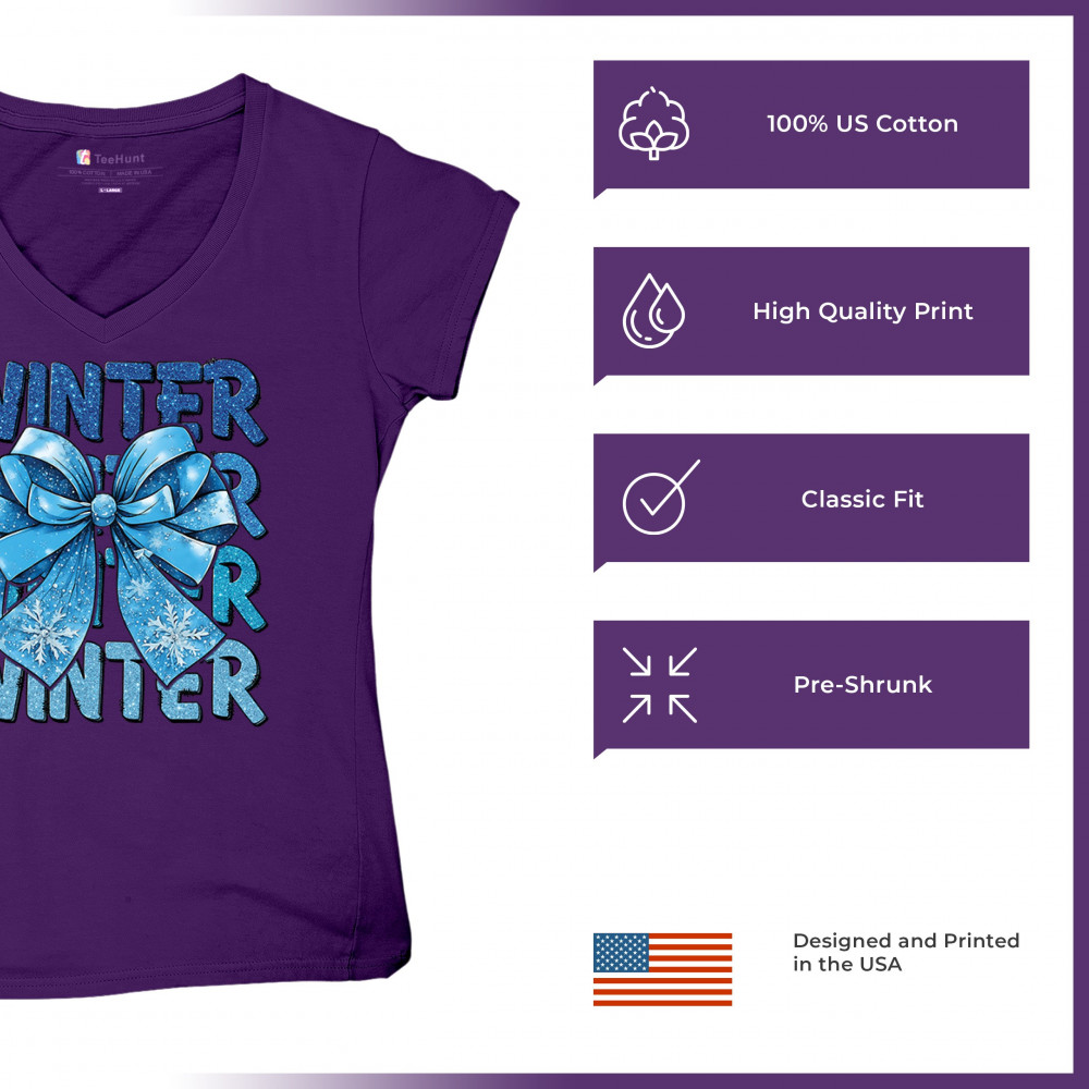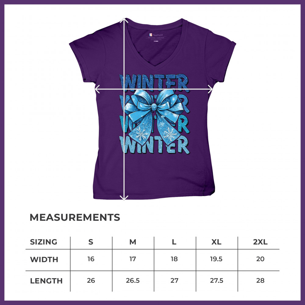 This shimmering winter bow design blends icy blue glitter style with bold repeating WINTER text for a bright seasonal statement. Snowflake accents and frosty tones create a cozy, cheerful vibe perfect for holiday outfits, gifting, or cold-weather lovers. A standout graphic that brings festive winter charm to any wardrobe and boosts seasonal search visibility.