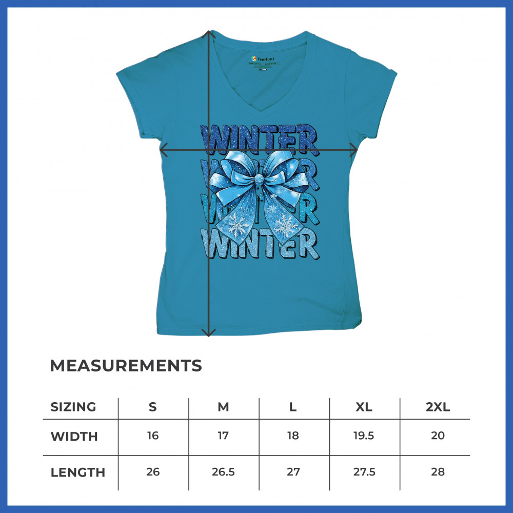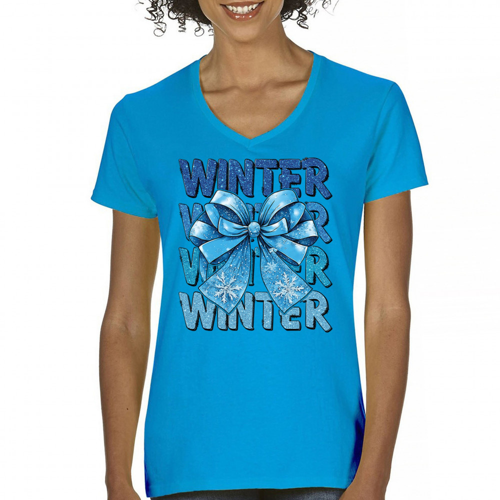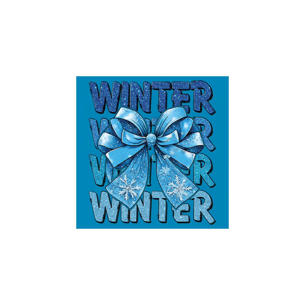 This shimmering winter bow design blends icy blue glitter style with bold repeating WINTER text for a bright seasonal statement. Snowflake accents and frosty tones create a cozy, cheerful vibe perfect for holiday outfits, gifting, or cold-weather lovers. A standout graphic that brings festive winter charm to any wardrobe and boosts seasonal search visibility.