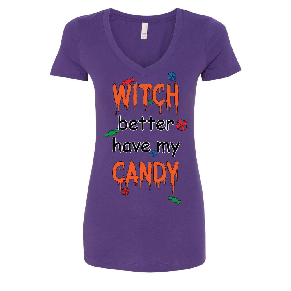 WITCH BETTER HAVE MY CANDY women's v-neck t-shirt halloween trick or treating purple