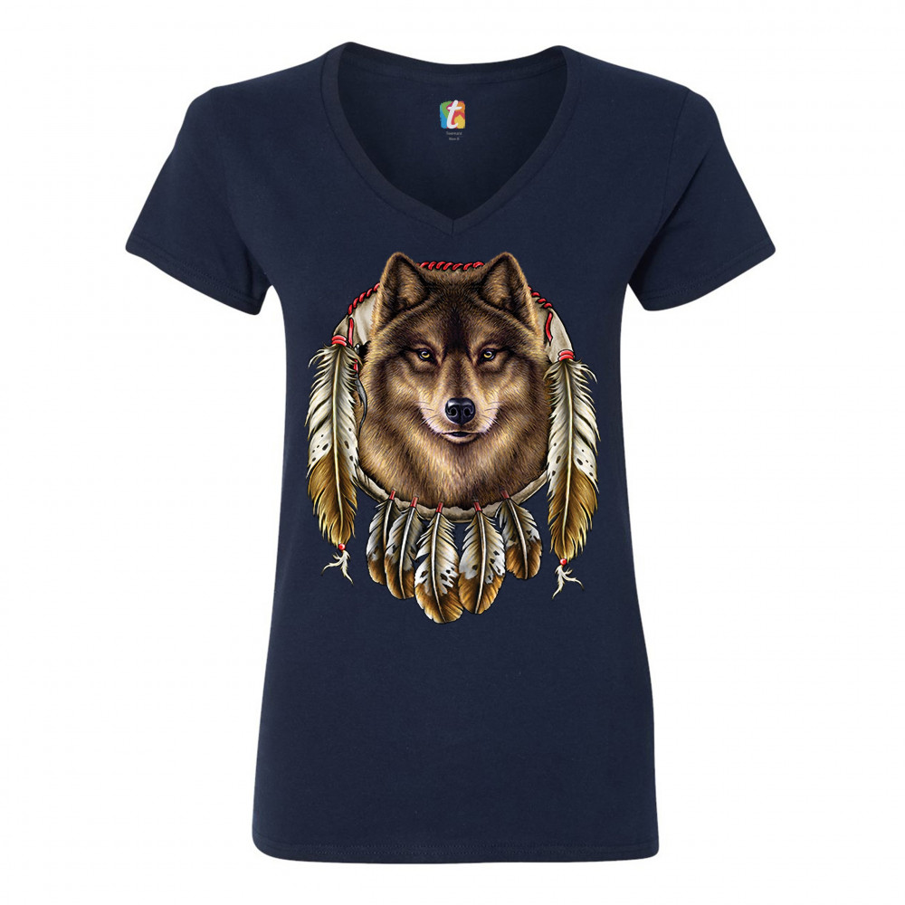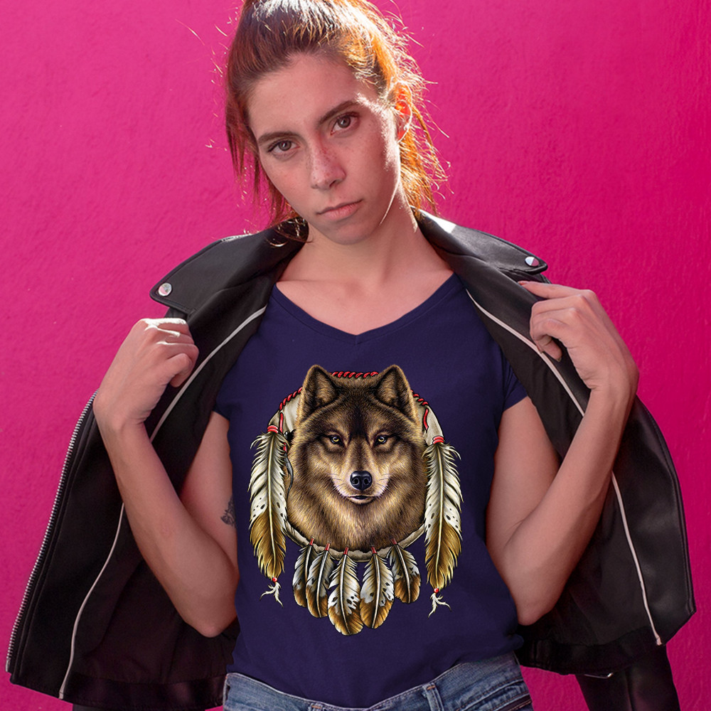 WOLF SPIRIT women's v-neck t-shirt native american dreamcatcher indigenous tee navy blue