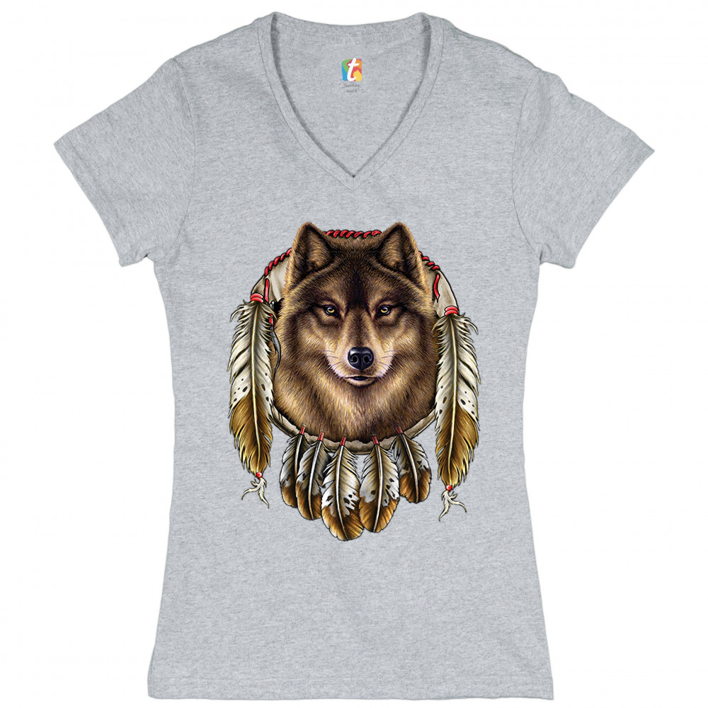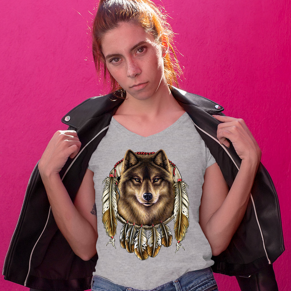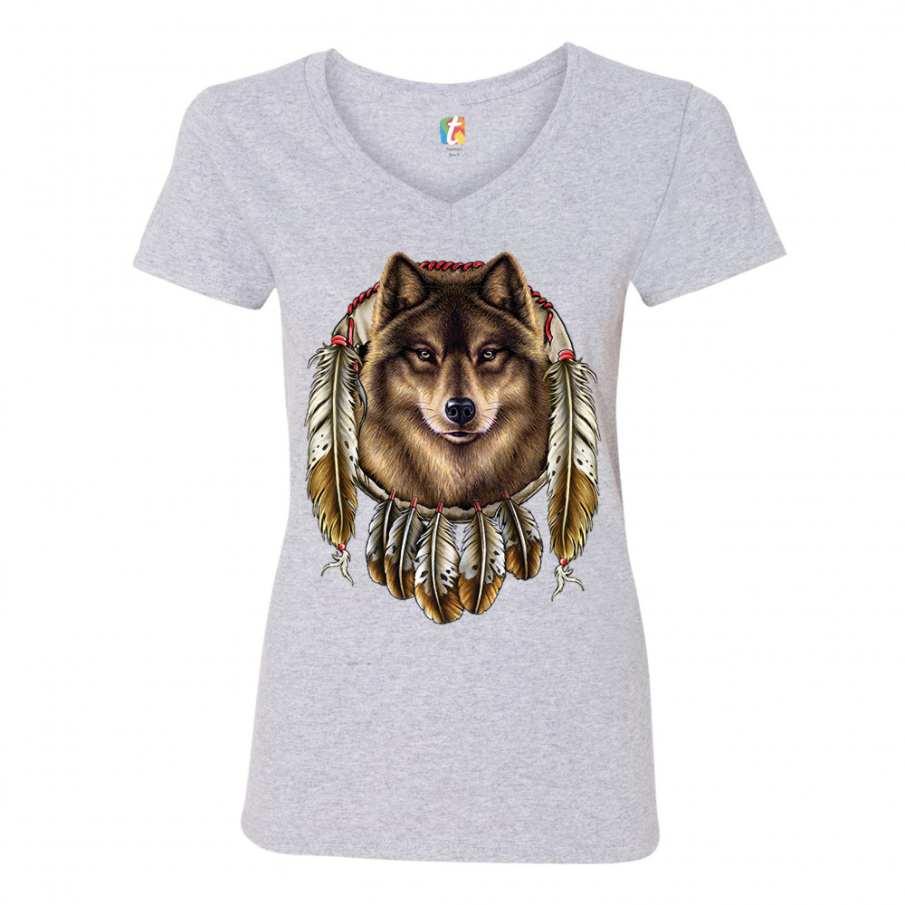 WOLF SPIRIT women's v-neck t-shirt native american dreamcatcher indigenous tee gray