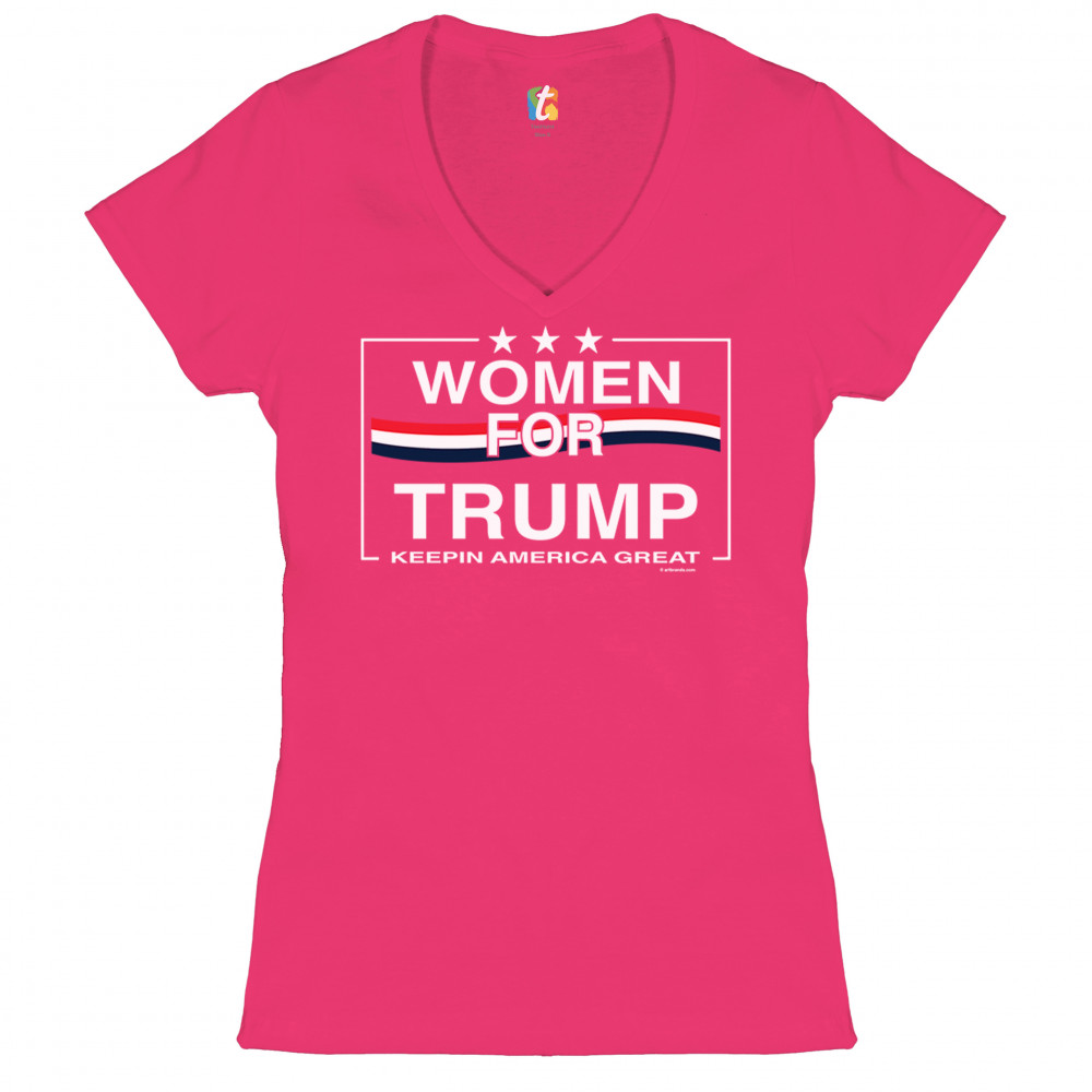 A political print saying "Women for Trump keepin America great". There are three stars above the caption and in the background there is a three-colored stripe. A great choice to wear for a Trump rally or give as a gift to a Donald Trump and Mike Pence supporter before 2020 presidential elections.
