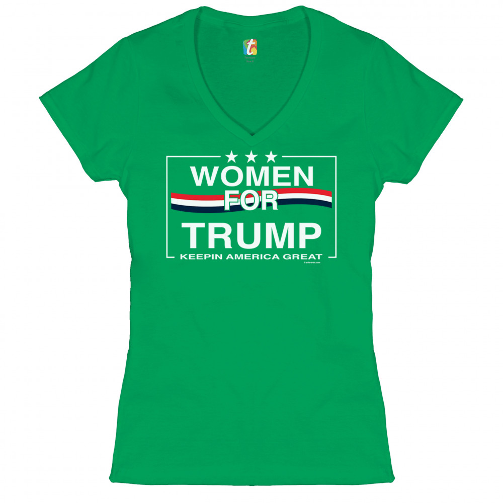 A political print saying "Women for Trump keepin America great". There are three stars above the caption and in the background there is a three-colored stripe. A great choice to wear for a Trump rally or give as a gift to a Donald Trump and Mike Pence supporter before 2020 presidential elections.