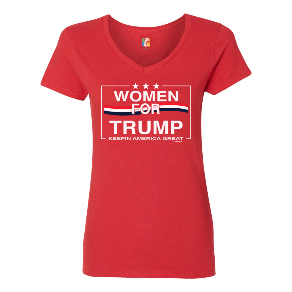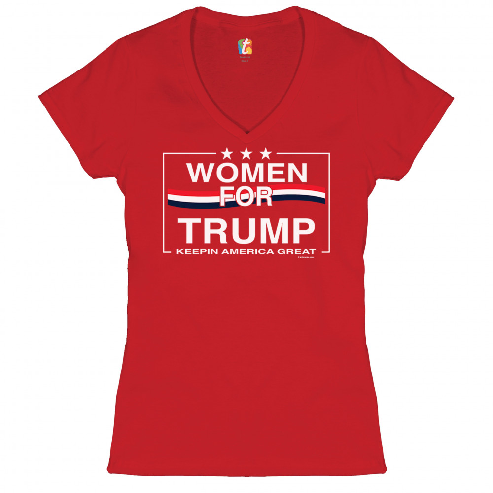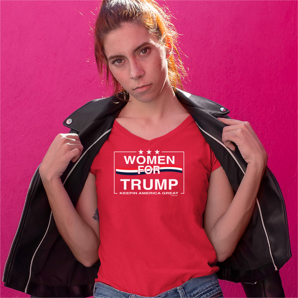 A political print saying "Women for Trump keepin America great". There are three stars above the caption and in the background there is a three-colored stripe. A great choice to wear for a Trump rally or give as a gift to a Donald Trump and Mike Pence supporter before 2020 presidential elections.