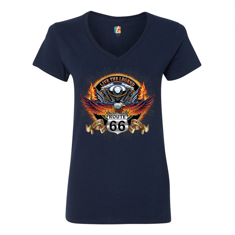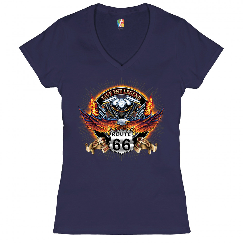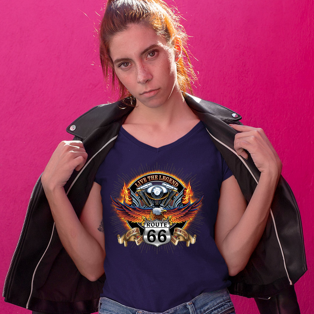 A print featuring an American bald eagle spreading it's wings while sitting on a "Route 66" sign. On a stripe behind the sign it says: "worldclass motorcycles since 1903". In the background there is a motorcycle engine with words: "live the legend" above