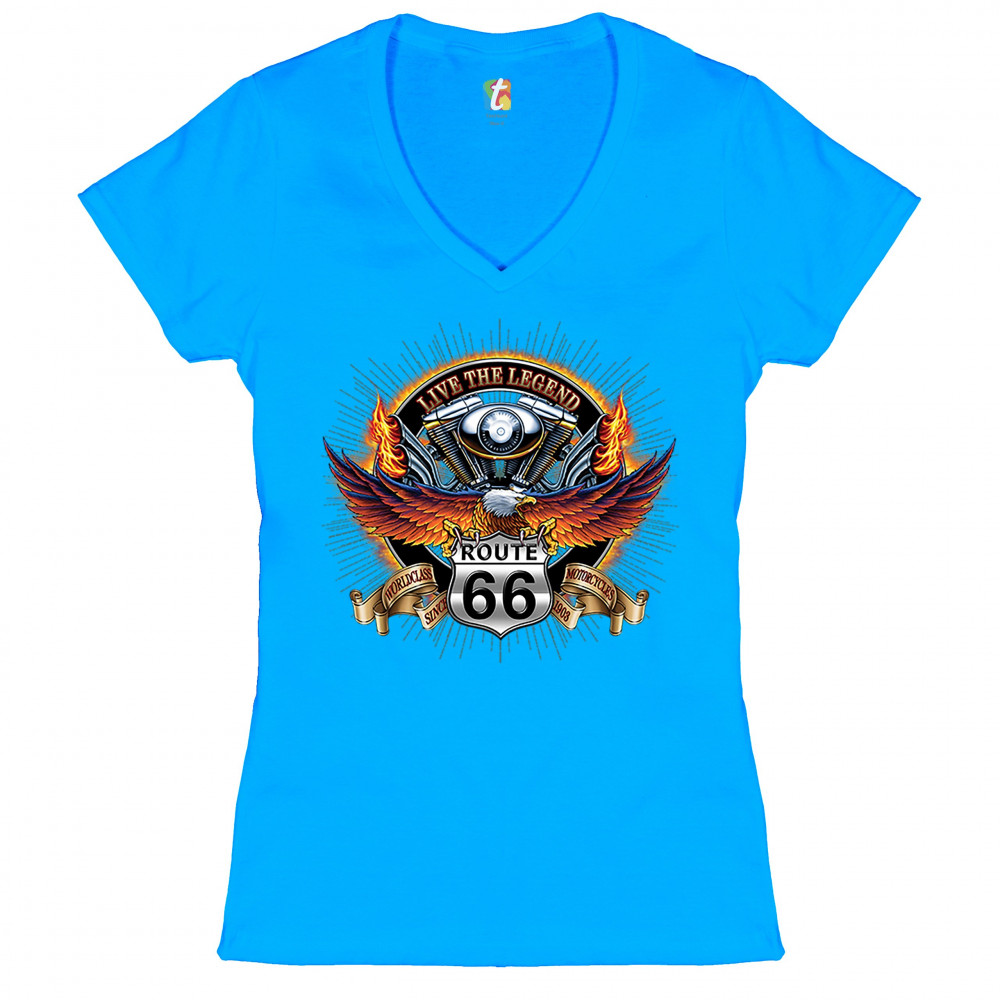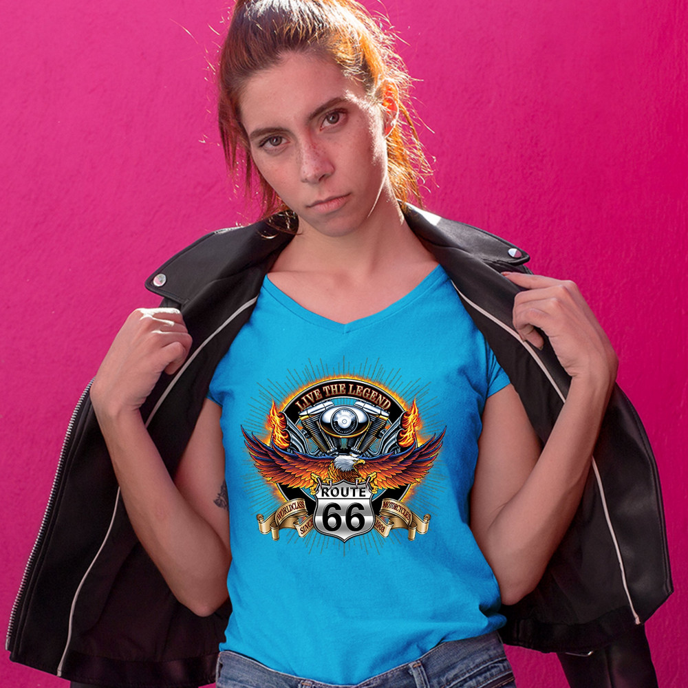 A print featuring an American bald eagle spreading it's wings while sitting on a "Route 66" sign. On a stripe behind the sign it says: "worldclass motorcycles since 1903". In the background there is a motorcycle engine with words: "live the legend" above