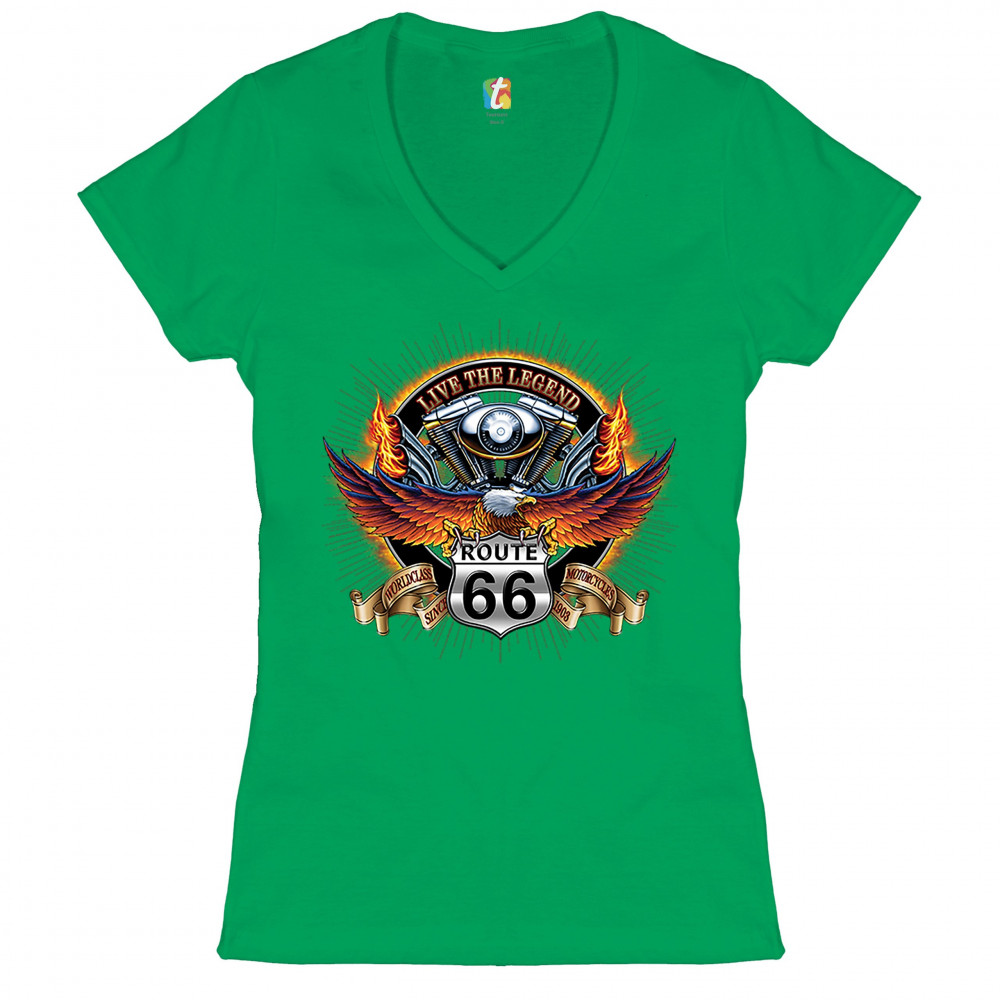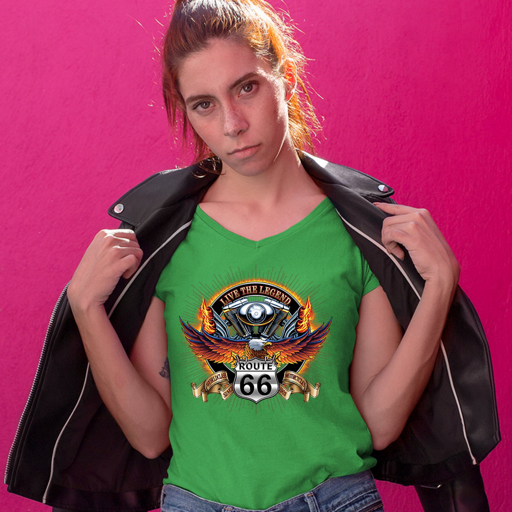 A print featuring an American bald eagle spreading it's wings while sitting on a "Route 66" sign. On a stripe behind the sign it says: "worldclass motorcycles since 1903". In the background there is a motorcycle engine with words: "live the legend" above