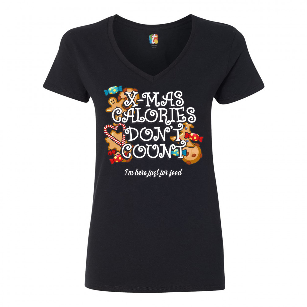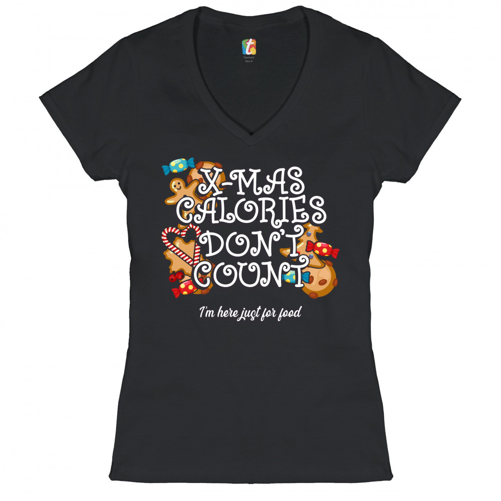 X-MAS CALORIES DON'T COUNT women's v-neck t-shirt merry christmas funny tee black