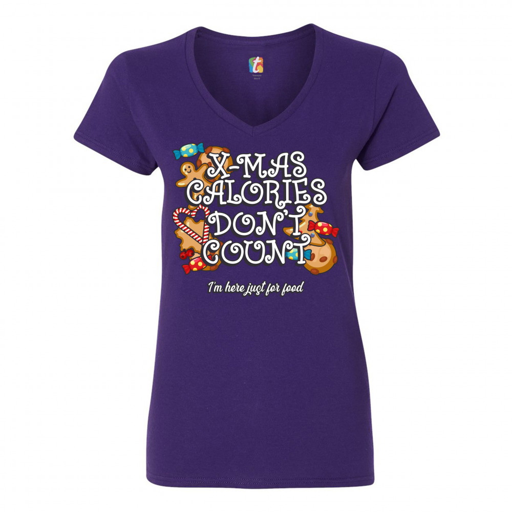 X-MAS CALORIES DON'T COUNT women's v-neck t-shirt merry christmas funny tee purple