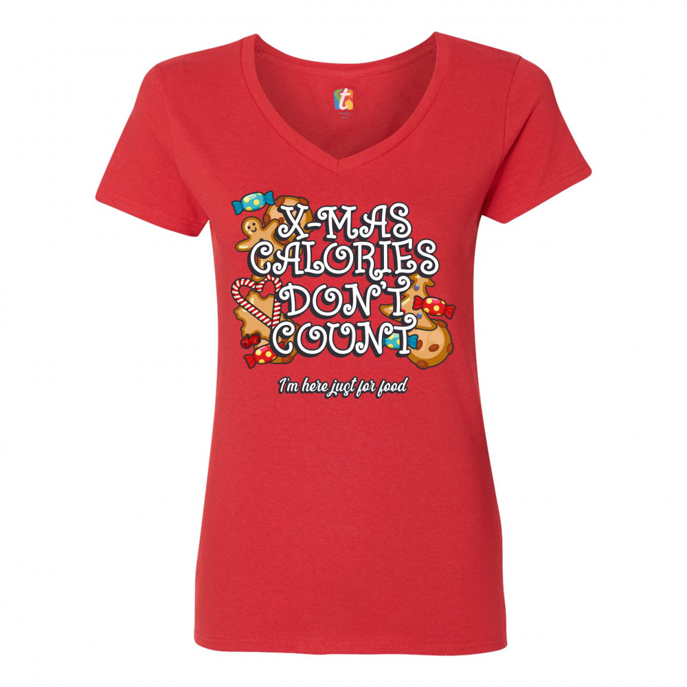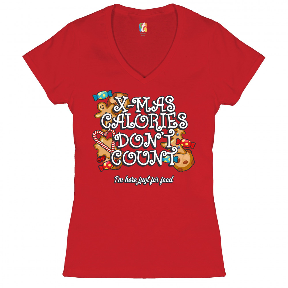 X-MAS CALORIES DON'T COUNT women's v-neck t-shirt merry christmas funny tee red