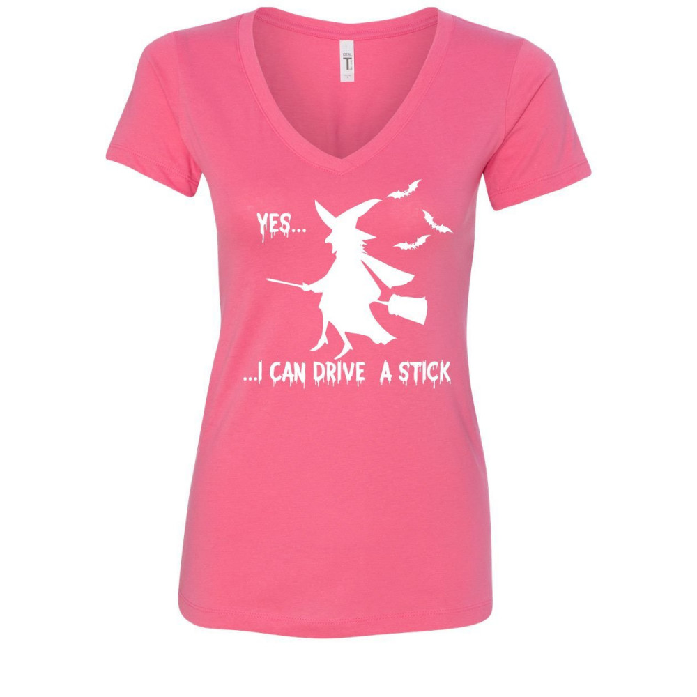 YES, I CAN DRIVE A STICK v-neck t-shirt funny halloween witch pink