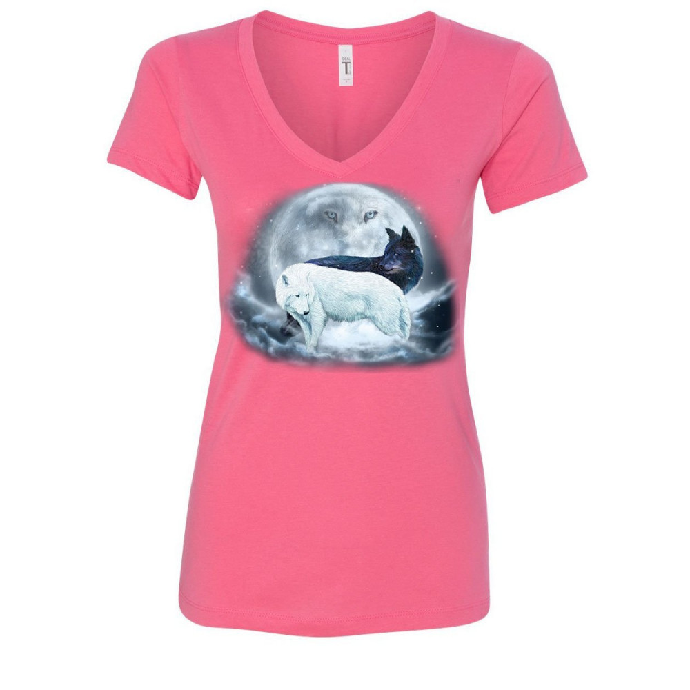 YIN & YANG WOLVES women's v-neck t-shirt animals wildlife nature wolf pack moon pink