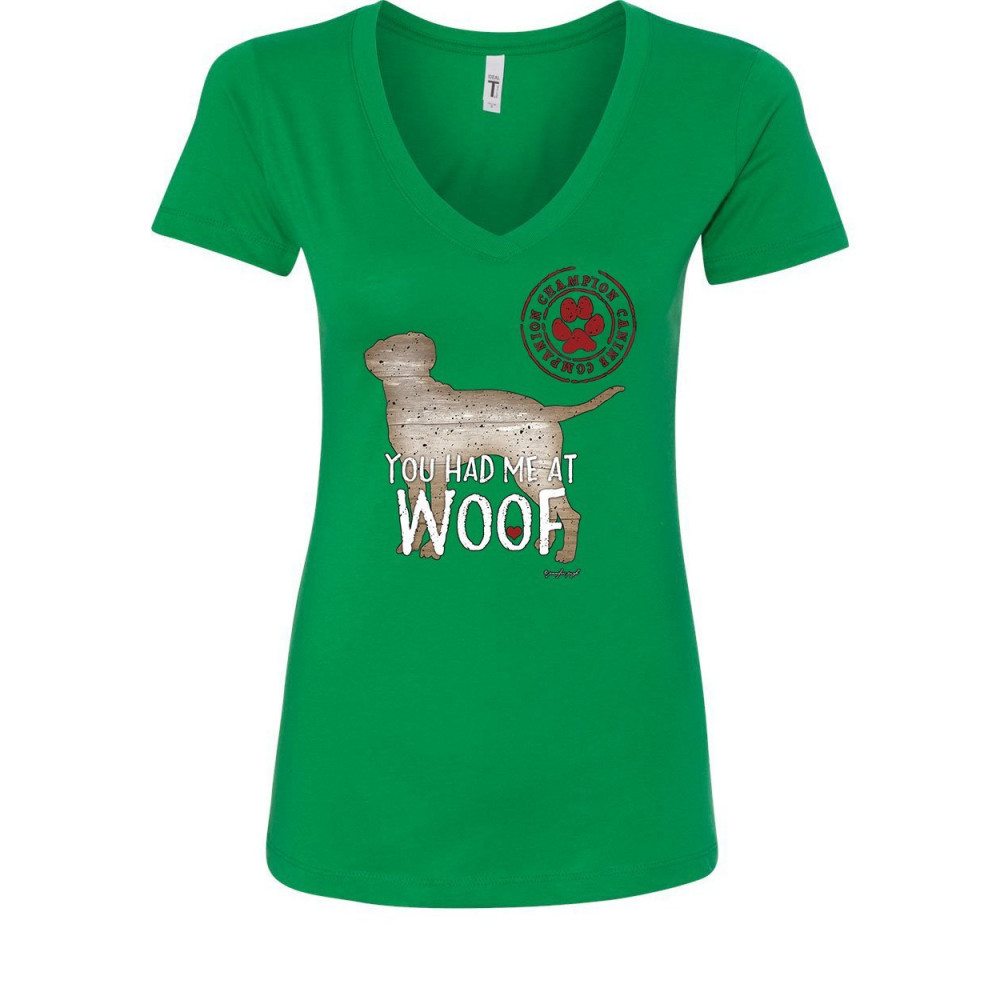 YOU HAD ME AT WOOF women's v-neck t-shirt pet friend dogs doggie puppy paw bark green