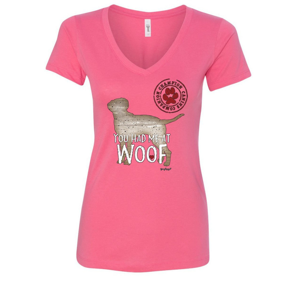 YOU HAD ME AT WOOF women's v-neck t-shirt pet friend dogs doggie puppy paw bark pink