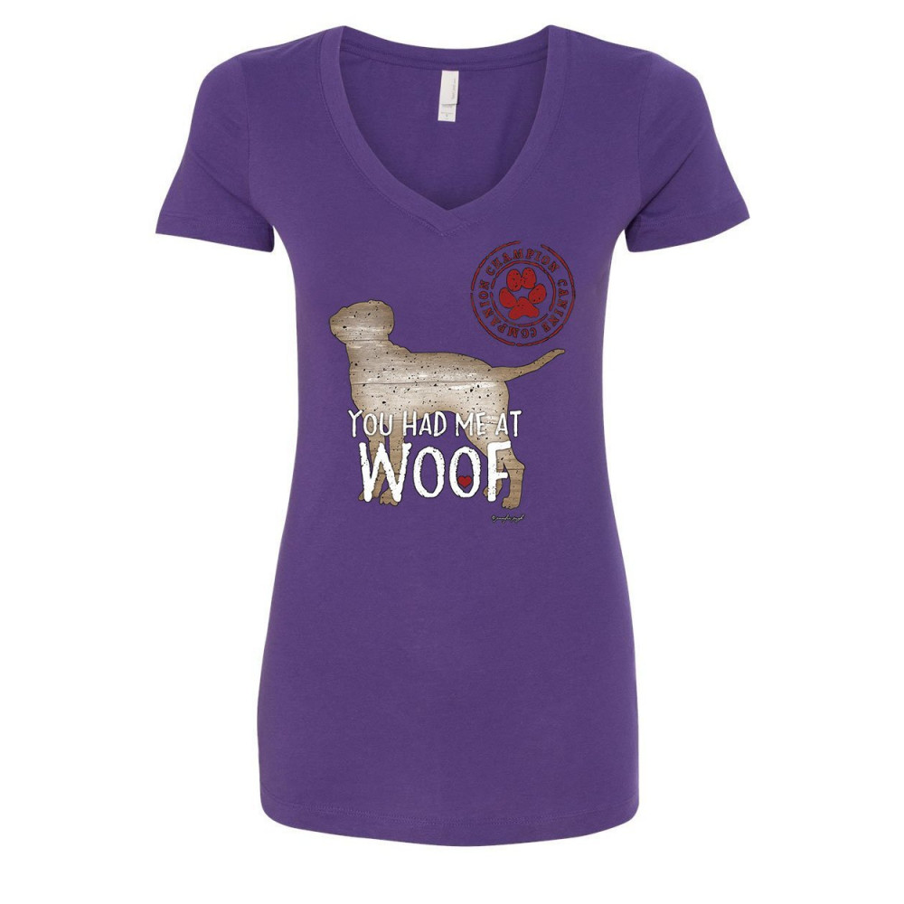 YOU HAD ME AT WOOF women's v-neck t-shirt pet friend dogs doggie puppy paw bark purple